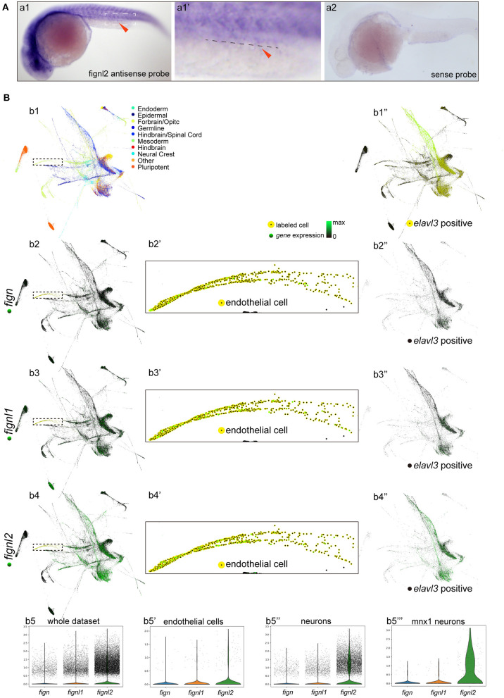 Expression of fign, fignl1, and fignl2 in zebrafish embryos. (A) Expression analysis of fignl2 using in situ hybridization. (a1) fignl2 expression is observed in the nervous system and somites at 24 hpf, and weak staining is also observed in caudal blood vessels (arrowhead) (Enlarged in a1). (a2)in situ hybridization using a fignl2 sense probe as control. (B) Single-cell expression analysis of fign, fignl1, and fignl2 during zebrafish development (a re-analysis of GEO GSE112294). (b1) Single-cells in the dataset (4–24 hpf) are mapped to different tissues. (b2–b4) Expression of fign, fignl1, and fignl2 in the single-cell dataset. (b5) Violin plot of fign, fignl1, and fignl2 expression in the single-cell expression dataset of zebrafish embryos (4–24 hpf). (b2-b4) Expression of fign, fignl1, and fignl2 in endothelial cells (18 and 24 hpf). (b5) Violin plot of fign, fignl1, and fignl2 expression in endothelial cells (18 and 24 hpf). (b1′′) Neuronal cells were isolated by elavl3 expression. (b2′′-b4′′) Expression of fign, fignl1, and fignl2 in elavl3-positive cells. (b5′′) Violin plot of fign, fignl1, and fignl2 expression in elavl3-positive cells. (b5′′′) Violin plot of fign, fignl1, and fignl2 expression in mnx1 positive cells. Expression data for violin plots are normalized and presented as counts per 104.