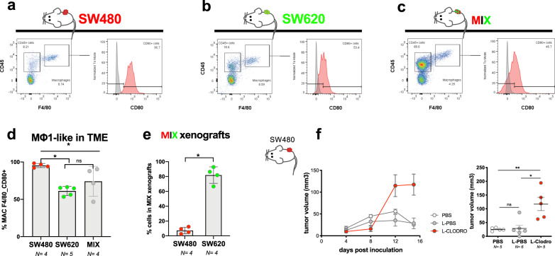 ac Representative graphs of flow cytometry analysis of the TME of SW480, SW620, and MIX mouse (Rag1−/−C57BL/6J) xenografts at 3 weeks post inoculation. d Quantification of double positive F4/80, CD80 macrophage in each TME, SW620 vs SW480. *P = 0.016, Cohen’s D g = 6.2; SW620 vs MIX ns = 0.29, Cohen’s D g = 0.83; SW480 vs MIX *P = 0.029, Cohen’s D g = 1.28). e Quantification of the percentage of each clone in MIX mice xenografts, *P = 0.029, Cohen’s D g = 7.68. d, e Data from quantification of flow cytometry analysis. Error bars represent mean ± S.D. f Growth curves of SW480 tumors treated with PBS, L-PBS, or L-Clodronate mice (f ns = 0.43, Cohen’s D g = 0.12, **P = 0.007, Cohen’s D g = 2.16, *P = 0.017, Cohen’s D g = 1.92). Error bars represent mean ± SEM. All data were analyzed using unpaired two-sided Mann–Whitney test. To avoid macrophage repopulation, mice were injected every 4 days (see “Methods”). N is depicted in the chart. Each dot represents one mouse xenograft. Source data are provided as a Source data file.
