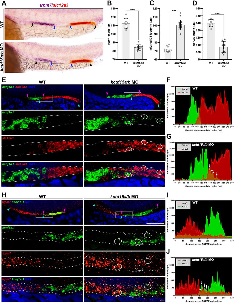 Fig. 4 Loss of kctd15a/b sways neighboring pronephric fates to express DE signature. (A) Whole-mount in situ hybridization for trpm7 (purple) and slc12a3 (red) in wild-type and kctd15a/b MO pronephric cells at 24 hpf. Blue arrowheads flank the inferred DE footprint; black arrowheads indicate anterior and posterior limits of the PST and DL. Scale bar: 35 μm. (B-D) Absolute length quantifications of the trpm7 expression domain, inferred DE footprint and slc12a3 expression domain. (E) Fluorescent in situ hybridization of kcnj1a.1 (green) and slc12a3 (red) at 24 hpf in pronephric cells in wild type and kctd15a/b MO. Magenta and cyan arrowheads indicate DE and DL boundaries, respectively. Gray box indicates the area shown at higher magnification below. White outlines indicate individual cells dually expressing kcnj1a.1 and slc12a3. Scale bars: 70 μm (top); 5 μm (bottom). (F) Wild-type fluorescent intensity plot of kcnj1a.1 (green) and slc12a3 (red). (G) kctd15a/b MO fluorescent intensity plot of kcnj1a.1 (green) and slc12a3 (red). White arrows indicate ectopic kcnj1a.1 signal invading the slc12a3 domain. (H) Fluorescent in situ hybridization of trpm7 (red) and kcnj1a.1 (green) at 24 hpf in wild-type and kctd15a/b MO pronephric tubules. Cyan and magenta arrowheads indicate PST and DE boundaries, respectively. Gray box indicates area shown at higher magnification below. White outlines indicate individual cells dually expressing kcnj1a.1 and trpm7. Scale bars: 70 μm (top); 5 μm (bottom). (I) Wild-type fluorescent intensity plot of trpm7 (red) and kcnj1a.1 (green). (J) kctd15a/b MO fluorescent intensity plot of trpm7 (red) and kcnj1a.1 (green). White arrows indicate ectopic kcnj1a.1 signal invading the trpm7 domain. n≥3 embryos quantified for each control and experimental group. ***P<0.001. Data are mean±s.d. Absolute lengths were compared using unpaired t-tests.
