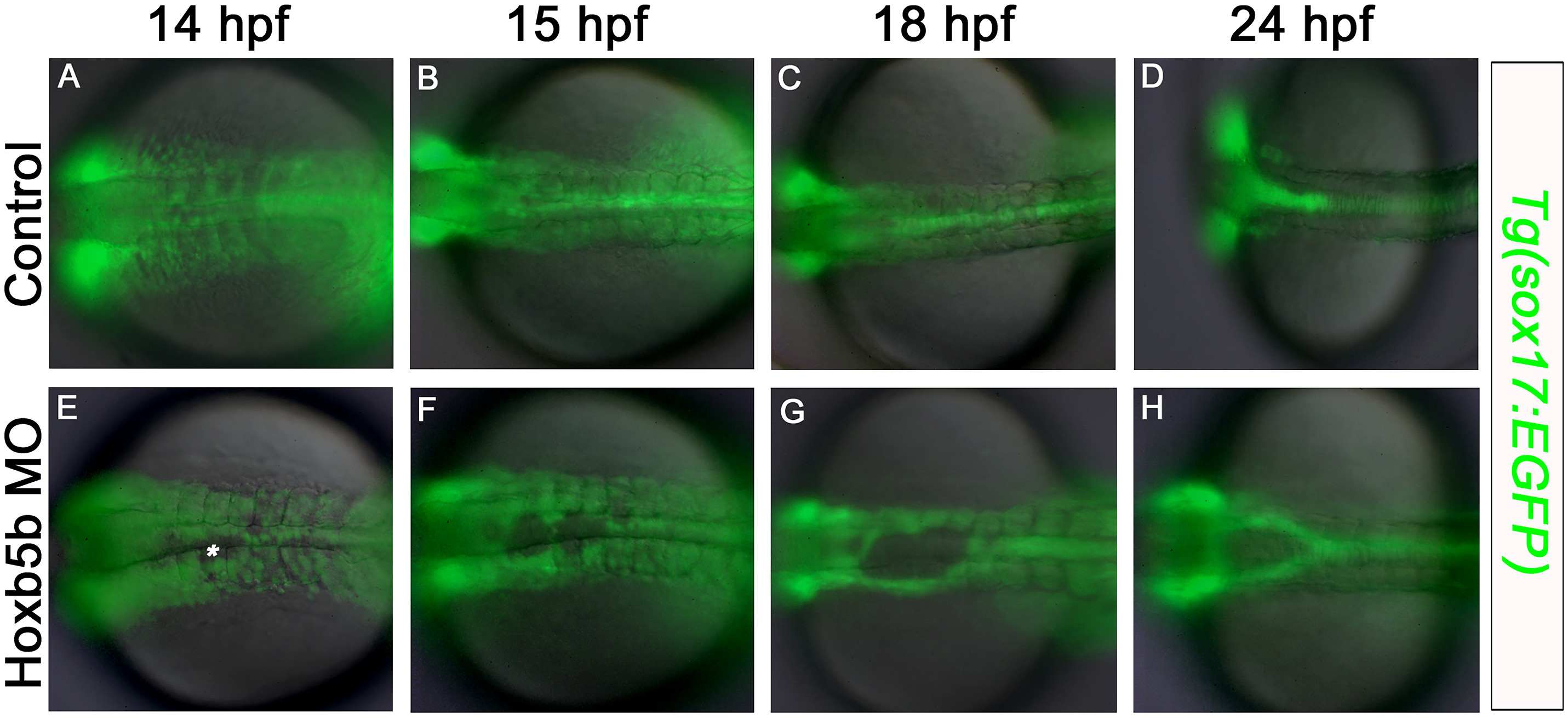 Fig. 5 Midline defects in the foregut endoderm first become apparent at 14 hpf in Hoxb5b morphants. Fluorescent imaging of live Tg (sox17:EGFP) embryos (A–D) control, and (E–H) Hoxb5b morphant, at (A,E) 14 hpf; (B,F) 15 hpf; (C,G) 18 hpf; (D,H) 24 hpf. At 14 hpf endoderm cell-free patches are apparent at the midline in Hoxb5b-deficent specimens (asterisk). Anterior to the left, results are from 2 independent experiments and minimum of 8 embryos per group.