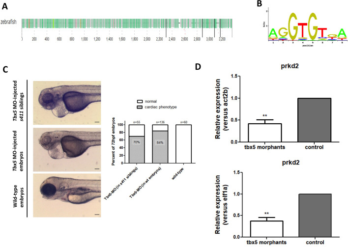 PRKD2 association with TBX5a regulation. Multiple predicted transcription factor Tbx5a binding sites in the promoter region of zebrafish Prkd2 via the ConTraV3 web server (A) and the possible DNA binding motif (B). Brightfield image analysis and quantification of 72 hpf tbx5a-morpholino injected s411 siblings, tbx5a-morpholino injected wild-type and control wild-type embryos (C). tbx5-morpholino injected s411 mutant embryos exhibit an earlier more severe phenotype reminiscent to the tbx5 morphants and mutants. Scale bars: 100 μm. As measured via rt-qPCR, prkd2 expression levels in tbx5 morphants are reduced compared to uninjected siblings at 56 hpf, normalized both to act2b and elf1a as reference genes (D). n=6 independent replicates, 15 larvae per sample, Student's t-test (two-tailed distribution, paired), ** significantly different P-value <0.01, error bars +s.e.m.