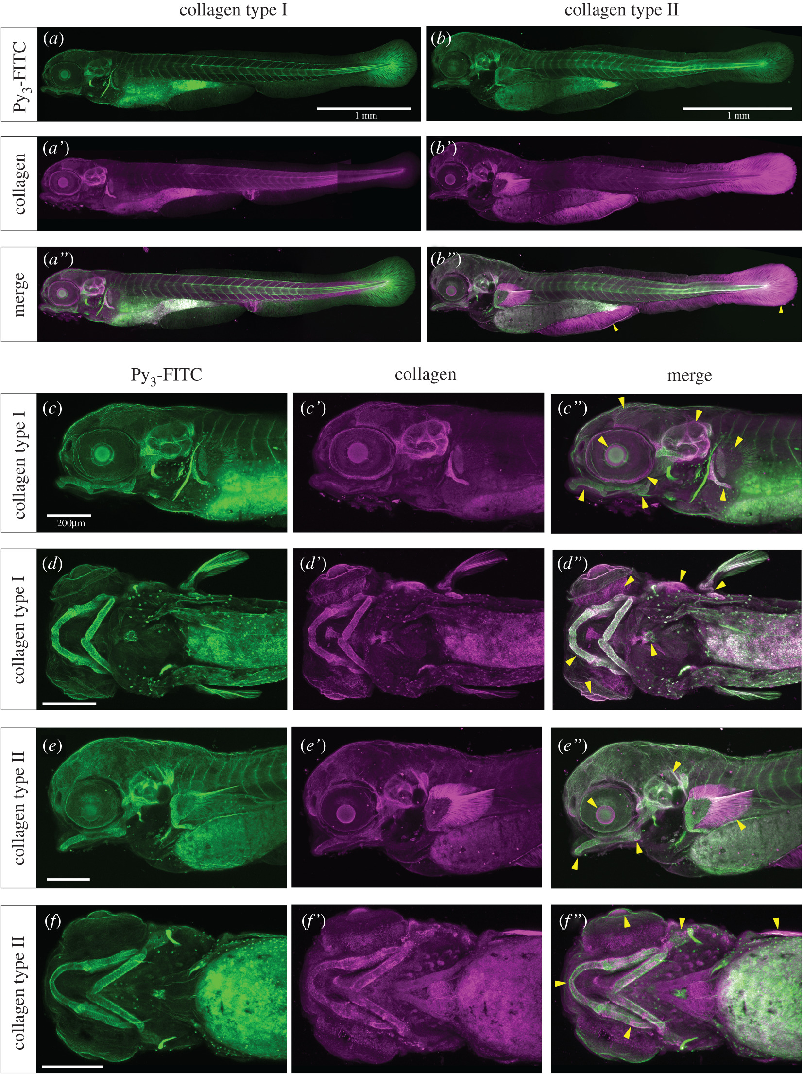 Fig. 5 Py3-FITC can stain collagen type I- or II-positive tissues in zebrafish embryos. Reconstructed (a–b″,c–c″,e–e″) lateral views and (d–d″,f–f″) ventral views of the Py3-FITC and anti-collagen (a–a″,c–d″) type I and (b–b″,e–f″) type II antibody-stained zebrafish embryos at 5 dpf. (a″,b″,c″,d″,e″,f″) Py3-FITC-stained regions overlapped with collagen type I- or type II-positive regions. The yellow arrowheads represent Py3-FITC and collagen expression overlapping regions (b″,c″,d″,e″,f″). Enlarged views are shown of collagen (c′,d′) type I- and (e′,f′) type II-stained regions and their merged images (c″,d″,e″,f″). Scale bars in a,b, 1 mm; c,d,e,f, 200 μm.