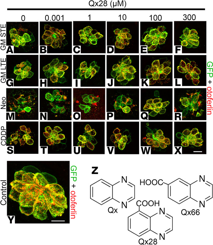 Figure 2 Qx28 treatment in neuromast hair cells. Representative images of 5 dpf Tg(brn3c:GFP) zebrafish pretreated with Qx28 (1 nM–300 μM) followed by coincubation with the different ototoxins. (A–F) Short-term effect (STE) of gentamicin 100 μM for 1 hour followed by 1-hour recovery in E3 water. (G–L) Long-term effect (LTE) of gentamicin 100 μM for 1 hour followed by 5-hour recovery in E3 water. (M–R) Neomycin 200 μM for 30 minutes followed by 1-hour recovery in E3 water. (S–X) CDDP 400 μM for 6 hours followed by 1-hour recovery. (Y) Vehicle control neuromast. GFP shown in green, otoferlin shown in red. Neuromasts were imaged employing a Zeiss LSM 800 confocal microscope with a 63× oil objective and Airyscan function. Scale bars: 7 μm (A–X), 5 μm (Y). (Z) Chemical structure of Qx, Qx28, and Qx66. For sample numbers see legend of Figure 3.