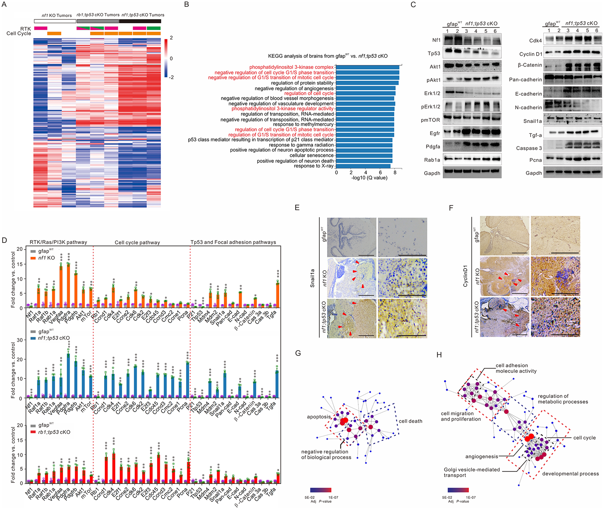 Fig. 6 Identification of downstream signalling pathways in tumours generated in zebrafish with various mutations. (A) Heat map of differential expression genes based on the ratios identified the fold-changes indicating gains (red) and losses (blue) in the randomly selected brain tissues with glioma formation derived from 3-month-old nf1 cKO (white bar), rb1;tp53 cKO (grey bar), and nf1;tp53 cKO (black bar) fish (n = 3 for each group). The amplifications of genes encoding RTKs Egfr (pink bars) and Pdgfra (green bars), as well as the amplification of cell cycle-related genes (Supplementary Table 6, orange bars) were also indicated. (B) KEGG pathway enrichment analyses of the tumours generated in nf1;tp53 cKO fish. (C) Western blot determinations were performed to confirm the expression of the key gliomagenesis-related factors in gfapWT (lanes 1–2) and nf1;tp53 cKO tumours (lanes 3–6). (D) Relative expression of key factors of RTK/Ras/PI3K, cell cycle, and focal adhesion pathways in nf1 KO, rb1;tp53 cKO and nf1;tp53 cKO fish, compared with gfapWT control (n = 3 for each group). (E and F) Gliomas associated with nf1 and tp53 mutations showed stronger expression of Snail1a (E) and cyclin D1 (F), particularly in the hypercellular area (arrowheads). Scale bars = 100 μm. (G and H) Network visualization of GO terms associated with the downregulated (G) and upregulated genes (H) in brain tissues between nf1;tp53 cKO and gfapWT control.