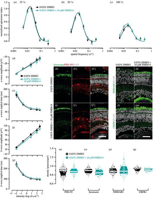 Fig. 8 Genetic compensation tests for pdzk1-KO mutants at 7 dpf. Spatial frequency tuning functions were fitted by a log-Gaussian model for control (pdzk1-KO mutants treated with 0.02% DMSO; black circles and lines) and experimental groups (pdzk1-KO mutants treated with 0.02% DMSO and 10-µM NMDi14; blue triangles and lines) at (a) 25°/s, (b) 50°/s, and (c) 100°/s. ERG results were shown as the group average (±SEM) of (d) a-wave amplitude, (e) a-wave implicit time, (f) b-wave amplitude, and (g) b-wave implicit time for pdzk1-KO mutants treated with 0.02% DMSO (filled black circles) and mutants treated with 0.02% DMSO and 10-µM NMDi14 (open cyan triangles). Data were compared using two-way ANOVA; there were no significant differences. Lines were fit by a four-parameter sigmoidal function. For histological assessment, (h–i″) serotonin and PSD-95 were co-labeled in green and red, respectively, for both groups; (j, k) NMDAR1and (l, m) CRFR1 were labeled in green. For all images, nuclei were stained with DAPI, shown in gray. Scale bars: 25 µm. Violin plots show densities in the IPL of (n) PSD-95, (o) serotonin, (p) NMDAR1, and (q) CRFR1 for mutants treated with 0.02% DMSO (black circles) and mutants treated with 0.02% DMSO and 10-µM NMDi14 (cyan circles). Points represent data from individual retinas. White lines represent medians, and dark bands indicate interquartile ranges. Unpaired t-tests were performed with 10 or 11 retinas per group (see Supplementary Table S6).