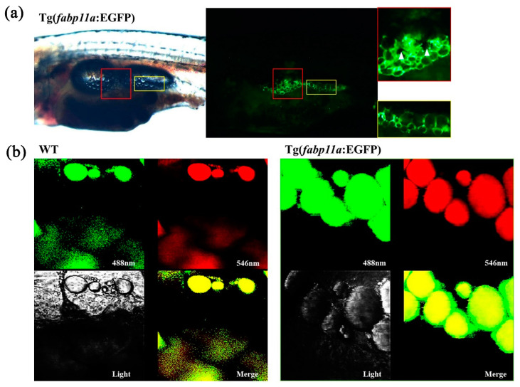 Figure 2 Visualization of adipocyte morphology in the transgenic zebrafish. (a) Images of trunk regions of zebrafish at 18 dpf and zoom-in views of the boxed areas. Red colored boxes show an area of pancreatic adipose tissue with multilayered adipocytes. Yellow colored boxes show an area of adipose tissue with single layer of adipocytes. White arrowheads indicate pigment cells. (b) Confocal images of adipocytes after Nile Red staining which is shown in both green and red. Green fluorescent signals are from both EGFP in the cytoplasm and Nile Red-stained lipid droplet, whereas red fluorescent signal is only from lipid droplet. Merged images show yellow lipid droplet and green cytoplasm.