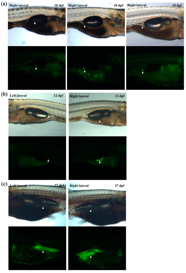 Figure 3 In vivo monitoring of visceral adipose tissue development in larvae using transgenic zebrafish. (a) Representative images of the first adipocyte emerging in three independent larvae at 10 dpf. (b) Representative images of visceral adipose tissues at 12 dpf. The first adipocyte of left lateral emerged. (c) Representative images of visceral adipose tissues at 27 dpf. White arrowheads indicate visceral adipose tissue.