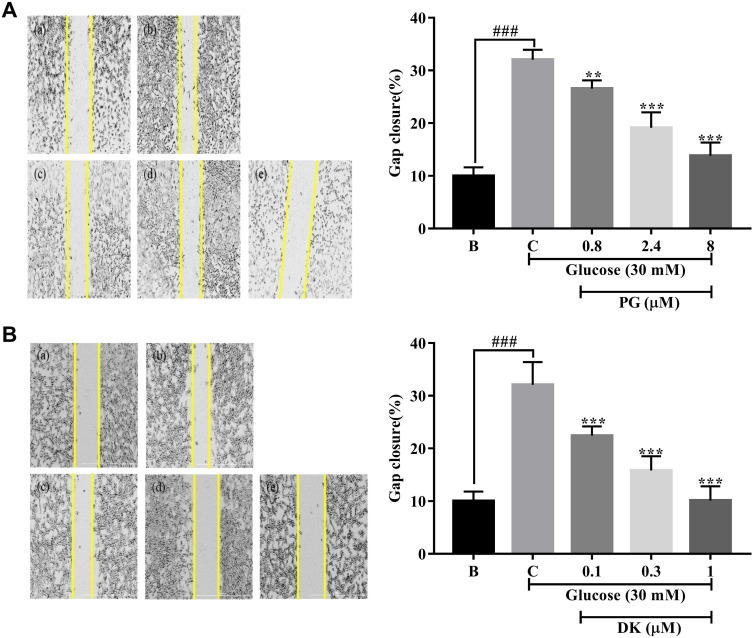 Fig. 3 Effects of phloroglucinol (PG) and dieckol (DK) on the migration of EA.hy 926 cells treated with a high concentration of glucose. (A) Images were acquired at the initial gap length (0 h) and final gap length (4 h) following treatment with PG in the cell-migration assay. (a) 0 mM glucose + 0 µM PG; (b) 30 mM glucose + 0 µM PG; (c) 30 mM glucose + 0.8 µM PG; (d) 30 mM glucose + 2.4 µM PG; and (e) 30 mM glucose + 8 µM PG; Quantitative evaluation of the inhibition of migration of EA.hy926 cells treated with a high glucose concentration after treatment with PG. (B) (a) 0 mM glucose + 0 µM DK; (b) 30 mM glucose + 0 µM DK; (c) 30 mM glucose + 0.1 µM DK; (d) 30 mM glucose + 0.3 µM DK; and (e) 30 mM glucose + 1 µM DK; Quantitative evaluation of the inhibition of migration of EA.hy926 cells treated with high glucose concentration after treatment with DK. The effect of 30 mM of glucose was compared to that of B; blank (0 mM glucose + 0 μM PG), ### p < 0.001. Percentage gap closure was normalized to that of C: control (30 mM glucose + 0 μM PG); ns, not significant, ** p < 0.01, *** p < 0.001.