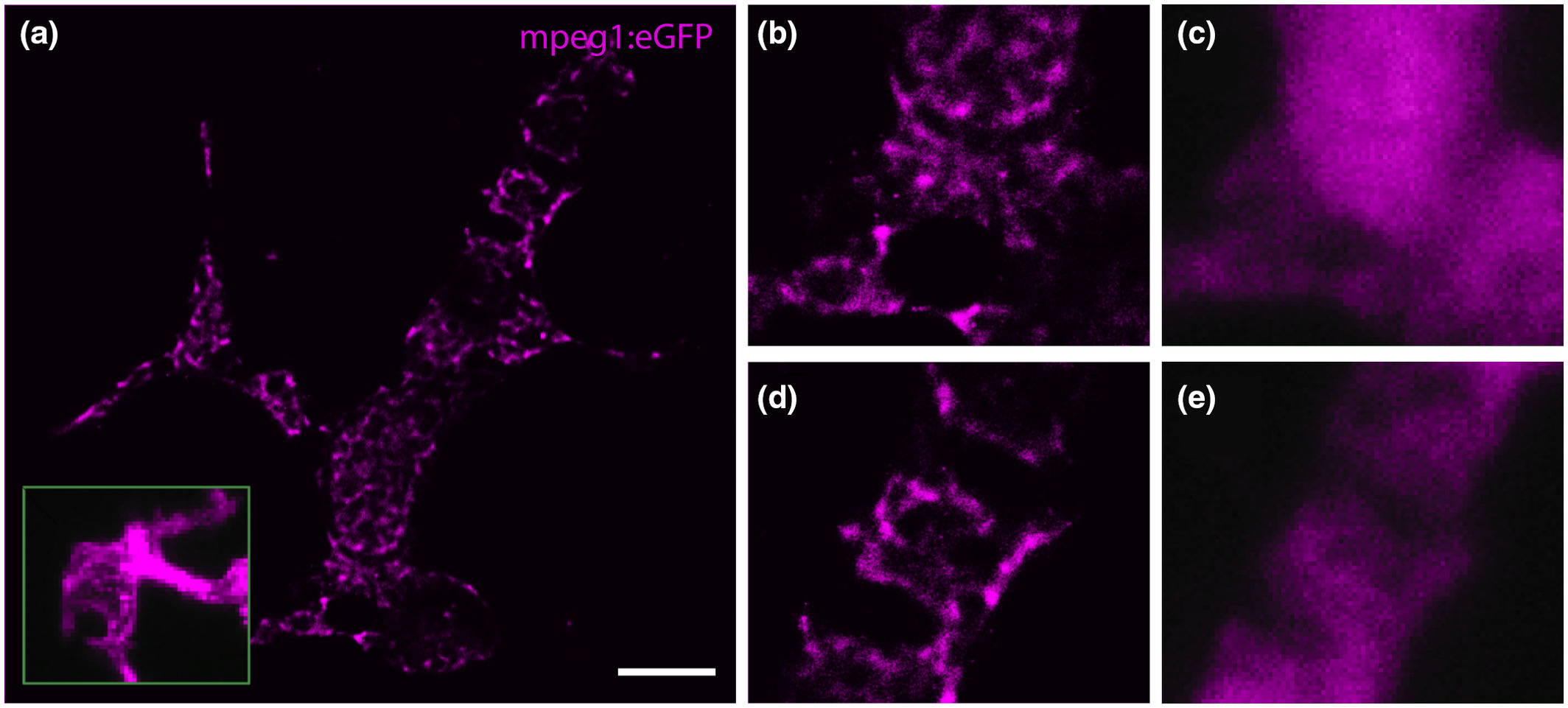 Fig. 9 (a) GSDIM reveals the intracellular distribution of mpeg1:eGFP (magenta) in microglia in the optic tectum of a zebrafish larva. Inset in a shows an mpeg1:eGFP expressing microglial cell captured with confocal microscopy for comparison. (b,d) Magnified areas from a showing the intracellular distribution of eGFP with their widefield fluorescence images in (c) and (e), respectively. Scale bar = 5 µm (a)