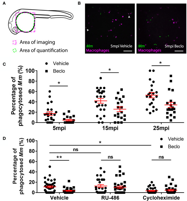 Figure 3 Effect of beclomethasone on phagocytic activity of macrophages and its dependency on Gr and de novo protein synthesis. (A) Schematic drawing of a zebrafish embryos at 28 hpf indicating the areas of imaging (purple dashed box, used for representative images) and quantification (green dashed circle) of Mm phagocytosis. (B) Representative confocal microscopy images of embryos of the Tg(mpeg1:mCherry-F) line injected with Mm at 28 hpf. Images were taken of infected embryos that were vehicle- or beclomethasone-treated at 5 minutes post infection (mpi). Macrophages are shown in magenta, bacteria in green. Scale bar = 100 μm. Arrowheads indicate bacterial clusters phagocytosed by macrophages. (C) Percentages of phagocytosed Mm clusters (of total number of Mm clusters) at 5, 15 and 25 mpi. Statistical analysis, performed by fitting data to a beta inflated regression with Tukey’s post hoc test, showed that beclomethasone decreased this percentage at all three time points. (D) Effects of RU-486 and cycloheximide on the beclomethasone-inhibited phagocytic activity. Embryos were treated with vehicle or beclomethasone and received either a vehicle, RU-486 or cycloheximide co-treatment two hours before injection of Mm at 28 hpf, and phagocytic activity was determined at 5 mpi. The significant inhibitory effect of beclomethasone on phagocytosis was not observed in the presence of RU-486. Cycloheximide, just like beclomethasone, significantly inhibited the phagocytic activity, and the combined cycloheximide/beclomethasone treatment showed the same level of inhibition. Statistical analysis was performed by fitting data to a beta inflated regression with Tukey’s post hoc test. In panels (C, D), each data point represents a single embryo and the means ± s.e.m. of data accumulated from three independent experiments are shown in red. Statistical significance is indicated by: ns, non-significant; *P<0.05; **P<0.01.