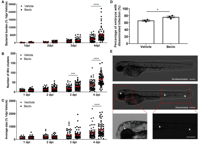 Beclomethasone effects on Mm infection progression and bacterial dissemination. (A–C). Bacterial burden (A), number of bacterial clusters (B) and the average size of bacterial clusters (C) were determined at 1, 2, 3 and 4 dpi following intravenous Mm injection (28 hpf) and treatment with vehicle or 25 µM beclomethasone, started at 2 h before infection. Significant increases due to the beclomethasone treatment were observed for all parameters at 4 dpi. For the number of bacterial clusters, the increase was also significant at 3 dpi. Statistical analysis was performed by two-way ANOVA with Tukey’s post hoc test. Each data point represents a single larva and the means ± s.e.m. of data accumulated from three independent experiments are shown in red. Statistical significance is indicated by: ***P<0.001; ****P<0.0001. (D) Effect of beclomethasone on dissemination of Mm by hindbrain ventricle injection. Hindbrain infections were performed at 28 hpf, and at 24 hours post infection (hpi), a significantly increased percentage of larvae with disseminated Mm infection was detected in the beclomethasone-treated group compared to the vehicle group. Statistical analysis was performed by two-tailed t-test. Values shown are the means ± s.e.m. of three independent experiments with a total sample size of 27 in the vehicle-treated group and 31 in the beclomethasone-treated group. Statistical significance is indicated by: *P<0.05. (E) Representative images of embryos with and without dissemination of the infection upon hindbrain injection of Mm. Scale bar = 200 μm.