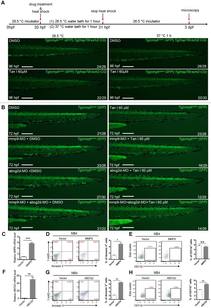 Fig. 7 (A) Rescue Tan I induced phenotype by overexpression of ezh2 in the zebrafish embryo. Fluorescent images of c-myb GFP+ cells in Tg(c-mybhyper:GFP) and Tg(hsp70l:ezh2:CG) double transgenic zebrafish embryos, with DMSO or Tan I treatments and with or without a 37 ºC heat shock for 1h, as indicated. dpf (days post-fertilization) (B) Rescue Tan I induced phenotype by knockdown of mmp9 and abcg2 in the zebrafish embryo. Fluorescent images of c-myb GFP+ cells in Tg(c-mybhyper:GFP) transgenic zebrafish embryos. As indicated, mmp9 and abcg2d morpholino was injected separately or together in DMSO or Tan I treated embryos. (C-E) Overexpression MMP9 in NB4 cells. RT-qPCR analyses of MMP9 mRNA level on the established NB4 cells transduced with an empty vector or MMP9-expressing vector (C). Flow cytometric analyses of Annexin V/7-AAD staining (D) and CD11b expression (E) in control or MMP9-overexpressed NB4 cells; (F-H) Overexpression of ABCG2 in NB4 cells. RT-qPCR analyses of ABCG2 mRNA level on the established NB4 cells transduced with empty vector or ABCG2-expressing vector (F). Flow cytometric analyses of Annexin V/7-AAD staining (G) and CD11b expression (H) in control or ABCG2-overexpressed NB4 cells. Scale bars: 200 µm.