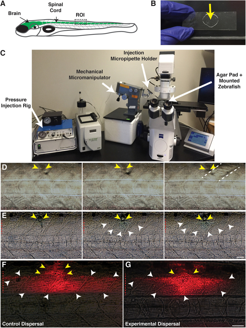 Focal delivery of solutions into the zebrafish spinal cord. (A) Cartoon of a zebrafish larvae identifying the brain and spinal cord (green). The boxed region identifies the injection site/targeted region of interest (ROI). (B) An agar pad (arrow) solidified on a borosilicate glass coverslip is used as a mounting platform for larvae to perform spinal cord injections. (C) An agar pad containing mounted larvae is placed on a microscope stage, equipped with a pressure injection rig and mechanical micromanipulator to hold the injection micropipette. (D) Muscle injections are identified by a wavy appearance following dispersal of the injection solution. Yellow arrows identify the injection site. Dotted lines denote the muscle segment injected. (E) Solutions remain localized within the spinal cord following a successful spinal cord injection. Yellow arrows identify the injection site in the dorsal spinal cord. White arrowheads identify the solution dispersal region. (F) Dispersal region of a control solution containing water and the fluorescent tracer, Dextran-647. Yellow arrows identify the injection site. White arrowheads identify the dispersal region. (G) Dispersal region of a lysolecithin solution including the fluorescent tracer Dextran-647. Yellow arrows identify the injection site. White arrowheads identify the dispersal region. Red dashed lines denote the spinal cord. Scale bar, 50 μm.