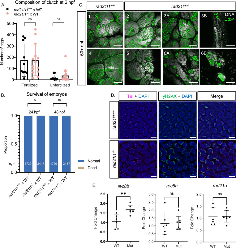 (A/B) Data resulting from test crosses between rad21l1-/- males and wild-type females to assess fertility and reproductive phenotype. rad21l1+/+ male tank mates were used as controls. No significant difference in the number of eggs the males caused the females to release, the composition of the resulting clutch at 6 hpf, or the survival of the embryos through 48 hpf. Data pooled from 14 crosses over 5 weeks using the same pool of 14 rad21l1-/- males, 12/14 of which crossed successfully at least once. Unpaired, two-tailed student t-test used for statistical analysis, ns = p>0.05. (C) Whole mount adult testes stained for DNA (gray) and Ddx4 (green) showing a phenotypic range of gonad morphology in rad21l1-/- males. All samples except #5 displayed large clusters of mature sperm. Images marked as A and B were taken from the same sample to show variation within a single gonad. Wild-type tank mates used as controls. Scale bar = 50 μm. (D) Testes sections stained with a PNA telomere probe (Tel; magenta), an antibody to γH2AX (green), and DAPI (blue), showing that telomere clustering and DSB localization (γH2AX) are normal in the rad21l1 mutant. Scale bar = 5 μm. (E) Fold change of relative mRNA expression for rad21l1 paralogs, rec8b, rec8a, and rad21a in wild-type versus the rad21l1-/- mutant (Mut). Fold change was determined using the 2-ΔΔCq method. eF1a (housekeeping) mRNA levels were used as a reference.