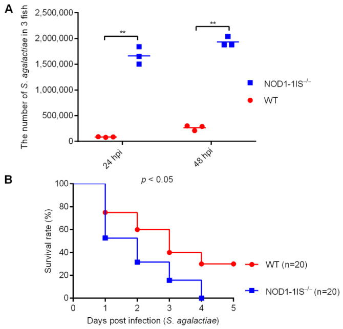 Figure 1 The effect of zebrafish NOD1 in Streptococcus agalactiae infection. (A) Effect of NOD1 knockdown on the proliferation of S. agalactiae in the mixture of liver and spleen from zebrafish at the age of 7 months. **, p < 0.01. (B) NOD1−/− zebrafish were more sensitive to S. agalactiae infection compared with the WT based on the survival rate.