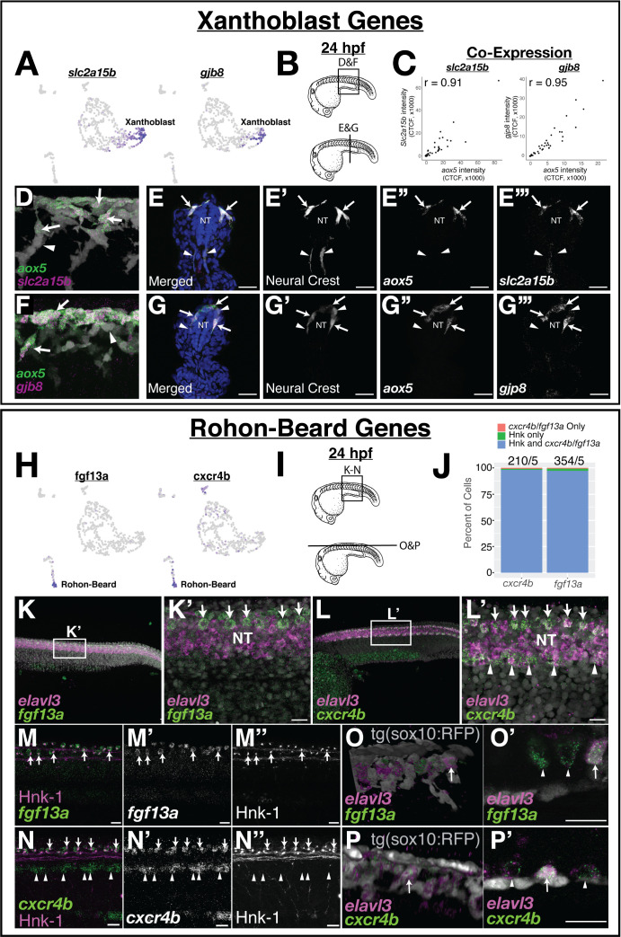 (A) Both slc2a15b and gjb8 are predicted to be expressed in pre-migratory xanthoblast cells. (B–G) Quantitative single-molecule in situ hybridization (hybridization chain reaction [HCR]) confirms expression of these genes to aox5 expressing xanthoblasts. (B) Schematic of 24 hr post fertilization (hpf) embryos labeling region of embryos shown in subsequent panels. (C) Quantification of RNA expression (corrected total cell fluorescence [CTCF]) in neural crest cells (NCCs) from sections shows novel marker genes slc2a15b and gjb8 are strongly co-expressed with aox5. Sections were taken every 15 µM and analyses were limited to sections over the yolk extension. Each dot represents a cell (slc2a15b = 3 embryos, 9 slides, 49 cells; gjb8 = 3 embryos, 9 slides, 58 cells). (D–G) Representative whole mount (D, F) and sections (E, G) show expression of slc2a15b (D, E) and gjb8 (F, G) in 24 hpf embryos. DAPI (blue, E, G) labels nuclei. Arrows point to NCCs co-expressing xanthoblast marker genes, while arrowheads point to NCCs that lack expression of these same genes. Note that a number of aox5/slc2a15b/gjb8 NCCs are pre-migratory in the dorsal neural tube (NT). (H) Both fgf13a and cxcr4b are predicted to be expressed in Rohon–Beard neurons (RBs). (I–P) HCR confirms expression of these genes to RBs. (I) Schematic labeling region of trunk shown in subsequent panels. (J) Percent of HNK-1-positive RBs also expressing cxcr4b and fgf13a indicates that these genes are co-expressed in RB cells. The number of HNK-1, cxcr4b, and fgf13a-positive cells in the dorsal NT was counted. Note almost all fgf13a/cxcr4b expressing cells co-localize to HNK-1-positive RB cells. Sample size reported above bars (#cells/#embryos). (K, L) Representative confocal images of whole-mount in situ hybridization for elavl3, fgf13a, and cxcr4b show expression of fgf13a and cxcr4b as two rows of cells in the dorsal NT (arrows). Elavl3 marks the NT, and DAPI (gray) labels nuclei. Note ventral NT expression of cxcr4b (arrowheads in L’). (M, N) Dual immunolabeling for HNK-1 and in situ hybridization for fgf13a (M) or cxcr4b (N) shows gene expression overlaps with HNK-1 labeling in RBs in the dorsal NT (arrows). Arrowheads mark ventral expression of cxcr4b in panel (N). (O, P) While fgf13a and cxcr4b expression was never observed in NCCs, a subset of putative RB cells express the tg(sox10:tagRFP) transgene (gray in panels O and P). Shown are whole-mount 3D projections (O, P) and single slice through z-stack (O’, P’) showing fgf13a/cxcr4b/elavl3-positive cells co-labeled with the sox10 transgene. Note that sox10-positive cells are positioned topologically similar to sox10-negative RB cells. Scale bars for all panels are 20 µM.