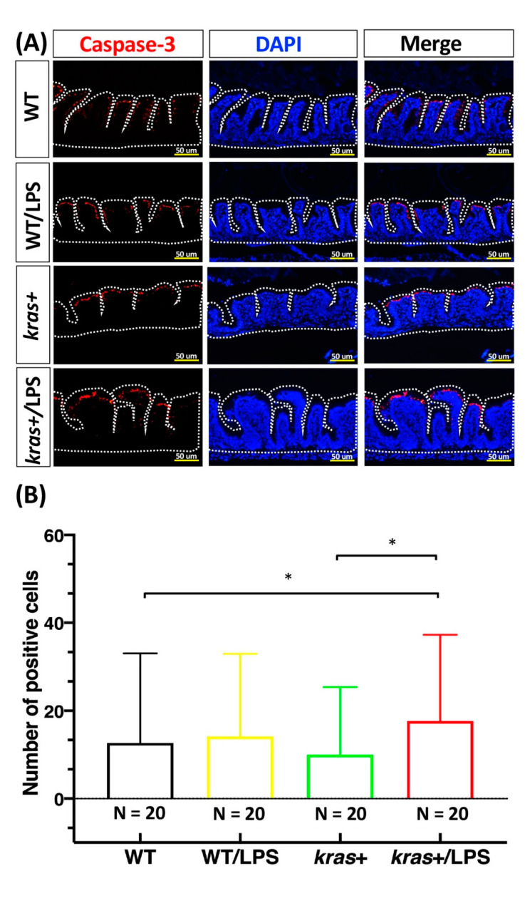Expression of krasV12 with LPS treatment enhanced the increase in cell apoptosis and cell proliferation in the intestinal epithelium. (A,C) Immunofluorescence staining (red) was carried out in intestinal paraffin sections of WT (N = 20), WT/LPS (N = 20), kras+ (N = 20), and kras+/LPS (N = 20) zebrafish. (B,D) Immunofluorescence staining of caspase-3 showing (1) apoptosis and (2) PCNA as a marker for cell proliferation as well as (3) quantification of the number and percentage of positive cells. Differences among the variables were assessed using Student’s t-tests. Statistical significance: * p < 0.05, *** p < 0.001. Scale bar: 50 μm.