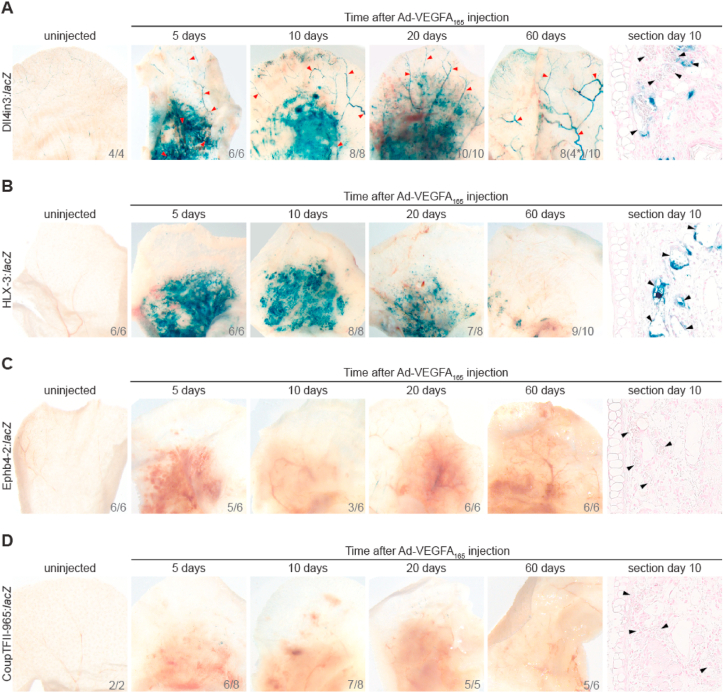 Intradermal injection of Ad-VEGFA164 results in sustained arterial and angiogenic enhancer activity, but venous enhancers were not reactivated. Ad-VEGFA164 was injected intradermally into the ears of adult Foxn1−/− mice transgenic for arterial and angiogenic-expressed Dll4in3: