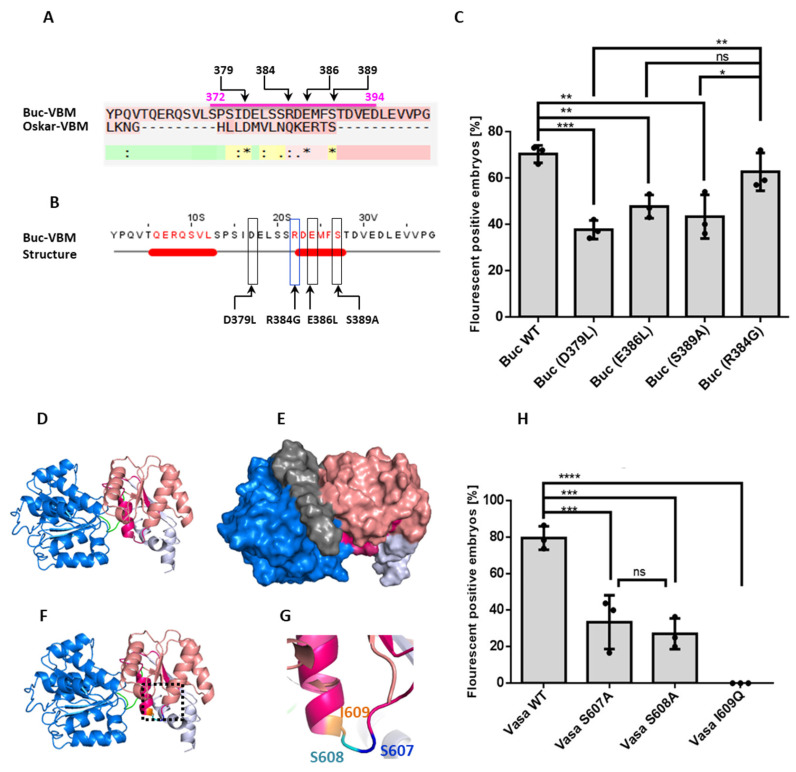 Isolation of the amino acid residues responsible for Buc and zfVasa interactions. (A) Alignment of the Buc-VBM with the Oskar eLOTUS domain. An asterisk (*) denotes the positions with a fully conserved residue. A colon (:) denotes conservation based on strongly similar properties—scoring > 0.5 in the PAM 250 matrix. A dot (.) denotes conservation based on weakly similar properties—scoring ≤ 0.5 in the PAM 250 matrix. An alignment of Buc-VBM and the eLOTUS domain revealed that D379, E384, and S386 are conserved between two sequences (black stars and positions of the amino acids are labeled on top of the sequence). (B) Representation of the three amino acids D379, E386, and S389 in JPred secondary structure prediction (black boxes) and amino acid R384 (blue box) used as a non-conserved control. (C) Quantification of mutant Buc construct interactions with zfVasa. The Y-axis represents the average fluorescent positive embryos. The X-axis represents the injected mutant Buc constructs. All the mutants, Buc D379L (36 ± 5.1%, n = 86), E386L (48 ± 9.4%, n = 77), and S389A (43 ± 3.4%, n = 50), showed a reduction of fluorescent embryos compared to wild-type Buc (70 ± 4.6%, n= 69) or in the control R384G (63 ± 8.2%, n = 63). In particular, the D379L mutant variant showed the weakest activity when compared to the Buc wild-type and control R384G. (D) Homology model predicted for zfVasa with the RecA-like N-terminal domain (blue) and RecA-like C-terminal domain (salmon). zfVasa-BBM is colored in magenta. (E) Surface representation of the predicted model showing the exposed region of zfVasa-BBM (magenta). (F) Model highlighting the exposed three amino acids (inset in the black dashed line) in the rainbow colors described in (D). (G) Magnification of the exposed amino acids S607 (blue), S608 (green), and I609 (orange). (H) Quantification of the mutant zfVasa construct interactions with Buc. The Y-axis represents fluorescent embryos from three independent experiments. The X-axis represents the injected mutant zfVasa constructs. zfVasa S607A (38 ± 14.0, n =61) and zfVasa S608A (27 ± 8.0, n = 33) showed a reduced number of fluorescence-positive embryos, whereas zfVasa I609Q completely lost the interaction (0 ± 0, n = 61) compared to the wild-type zfVasa (79 ± 6.4, n = 64). Moreover, there was no significant statistical difference observed between zfVasa S607A and S608A. Test statistics: Student’s t-test, * = 0.05, ** = 0.01, *** = 0.001, and **** = 0.0001. ns = not significant.