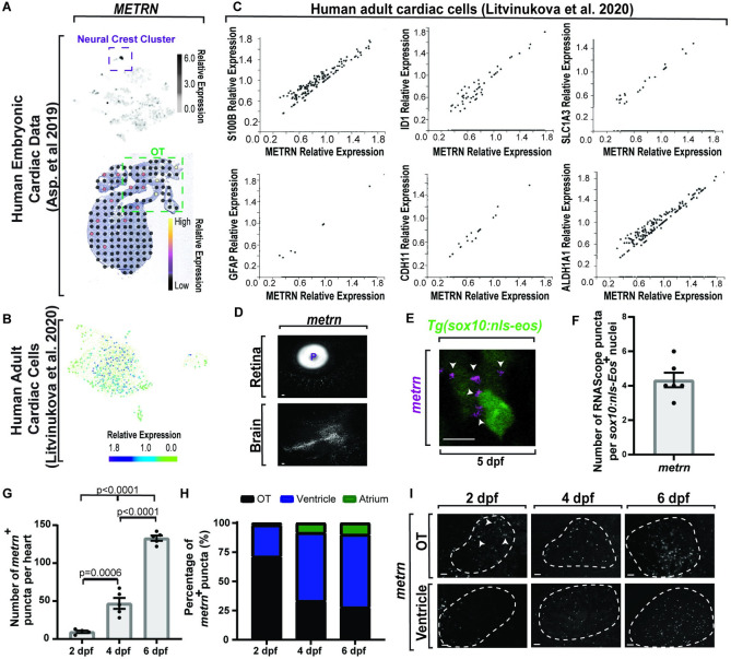 (A) Top: single-cell sequencing of METRN in human embryonic hearts [64]. METRN is most up-regulated in the neural crest cluster (purple dotted box). Scale bar denotes relative gene expression. Bottom: spatiotemporal sequencing [64] of METRN in human embryonic hearts. Dot color denotes relative transcript expression. (B) Single-cell sequencing [65] from the neuronal cluster of human adult hearts. Scale bar denotes relative gene expression. (C) Coexpression of METRN and astroglial genes from human adult single-cell sequencing data [65]. Axes denote relative gene expression. (D) Confocal 20 μm z-projection of 6 dpf zebrafish animals with metrn RNAScope. Metrn localizes to the retina and the brain. (E) Confocal z-sections of metrn RNAScope 5 dpf Tg(sox10:nls-eos) zebrafish embryos. Metrn+ puncta (white arrowhead) localize to Eos+ cells. (F) Quantification of metrn+ puncta per cell in the heart. (G) Quantification of the number of metrn mRNA puncta in the heart at 2, 4, and 6 dpf. (H) Quantification of locational development of metrn mRNA puncta in the heart at 2, 4, and 6 dpf. (I) Confocal z-sections of metrn mRNA puncta (white arrowheads) across location and time in the heart (white dotted outline). Data are represented as mean ± SEM. Scale bar equals 10 μm. Statistics summarized in S1 Table. See S1 Data for raw data. dpf, days postfertilization; OT, outflow tract; P, pupil.