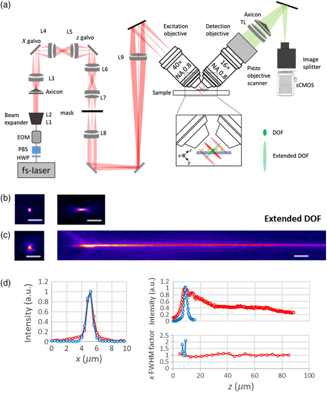 (a) Schematic of 2p LSFM with axicon imaging. Inset shows the extended DOF using axicon imaging. Measured PSFs (b) without and (c) with axicon imaging. (d) The corresponding intensity line profiles of measured PSF and lateral FWHM factor at different axial positions: lateral (left), axial (upper right); lateral FWHM factor (lower right). Red: with axicon imaging. Blue: without axicon imaging. HWP, half-wave plate; PBS, polarization beam splitter; L1 to L9, achromatic doublet lens; and TL, tube lens. Scale bars: