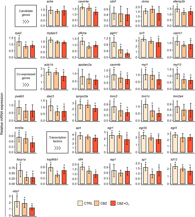 Fig. 3 Expression differences of selected candidate genes, cavin4a co-expressed genes, and TFs involved in cardiovascular formation and functions in the three treatment groups. Means and standard deviations of fold changes in expression of eight biological replicates are shown for each of the groups. Significant differences between treatments are indicated by different letters (p < 0.05, Tukeys HSD test).