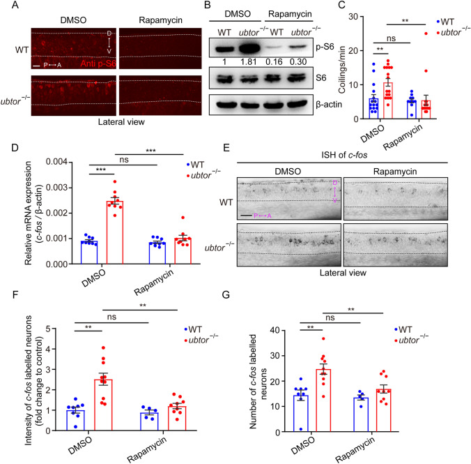 Rapamycin normalizes spontaneous movements and the activity of spinal interneurons in 28-hpf ubtor mutant embryos. A p-S6 staining in the spinal cord of 28-hpf embryos treated with DMSO (solvent) or 100 nmol/L rapamycin (dashed lines, spinal somites 4–10; scale bar, 40 μm). B Immunoblotting for p-S6 and S6 protein in 28-hpf embryos treated with DMSO or 100 nmol/L rapamycin. Quantified p-S6 protein levels are indicated. C Frequency of coiling movements outside the chorion of 28-hpf embryos treated with DMSO or rapamycin (two biological repeats, DMSO: NWT = Nubtor−/− = 16, t29 = 2.974; rapamycin: NWT = Nubtor−/− = 16, t29 = 0.189). D RT-qPCR analysis of c-fos mRNA levels in 28-hpf embryos treated with DMSO or rapamycin (three biological repeats, DMSO: NWT = Nubtor−/− = 75, t16 = 11.57; rapamycin: NWT = Nubtor−/− = 75, t16 = 1.389). E Expression and distribution of c-fos using in situ hybridization assays in 28-hpf embryos treated with DMSO or 100 nmol/L rapamycin (spinal somites 4–10; scale bar, 40 μm). F, G Relative intensity (DMSO: NWT = 8, Nubtor−/− = 10, t16 = 4.246; rapamycin: NWT = 6, Nubtor−/− = 9, t12 = 1.586; F) and number (DMSO: NWT = 8, Nubtor−/− = 10, t16 = 3.520; rapamycin: NWT = 6, Nubtor−/− = 9, t12 = 1.453; G) of c-fos labeled spinal interneurons in 28-hpf embryos treated with DMSO or rapamycin. β-actin served as thein ternal control. Values are represented as the mean ± SEM in C, D, F, and G. **P <0.01, ***P <0.001.