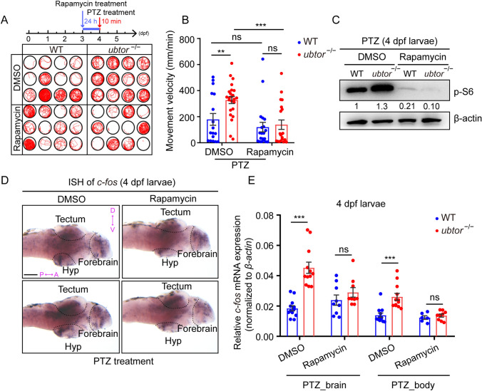 Rapamycin rescues seizure susceptibility in PTZ-induced ubtor mutant larvae. A, B Locomotion tracks A and movement velocity B of 4-dpf larvae pre-treated with DMSO (NWT = Nubtor−/− = 24, t39 = 2.987) or 2 µmol/L rapamycin (NWT = Nubtor−/− = 24, t38 = 0.365), followed by 3 mmol/L PTZ (two biological repeats).C Immunoblotting for p-S6 protein in 4-dpf larvae treated as in A. Values of p-S6 protein levels are indicated. D Expression and distribution of c-fos mRNA in brain tissue of 4-dpf larvae treated with rapamycin and PTZ (scale bar, 100 μm). E RT-qPCR analysis of c-fos mRNA levels in the brain and spinal tissues of 4-dpf larvae treated with control or rapamycin, followed by 3 mmol/L PTZ (three biological repeats, control: NWT = Nubtor−/− = 75; rapamycin: NWT = Nubtor−/− = 75). β-actin served as the internal control. Values are represented as the mean ± SEM in B and E. **P <0.01, ***P <0.001.