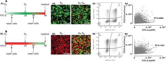 Figure 3 Subsequent transfection of eGFP mRNA single-lipoplexes and mCherry mRNA single-lipoplexes. A1,B1) Transfection scheme of cells, A2,B2) representative confocal images of cells after 1 time (left panel) and 2 times (right panel) transfection with single-lipoplexes. A3,B3) Representative flow cytometry dot plots of cells receiving two subsequent transfections and A4,B4) correlation between red and green fluorescence as derived from flow cytometry dot plots. Scale bar: 100 µm. All the experiments have been triplicated in three independent days (n = 9). The mRNA dose was 0.1 µg/well per transfection round, leading to a total mRNA amount of 0.2 µg/well after the second transfection.