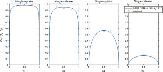 Figure 4 Simultaneous best fit (blue solid line) of the 4 correlation functions to the experimental correlation values (red circles) with D(K), pe and m as global fitting parameters. From left to right the four considered conditions are displayed in order of decreasing correlation: cargo uptake delivered by mingle-lipoplexes, cytosolically released cargo from mingle-lipoplexes, cargo uptake by single-lipoplexes and cytosolically released cargo from single-lipoplexes. Per condition the three considered cargo amounts are included: α1 = 0.25, 0.5, and 0.75 (corresponding to α1 = 0.75, 0.5, and 0.25, respectively)