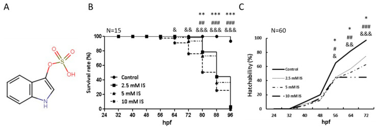 Toxicity profile of IS as indicated by the survival and hatchability of zebrafish embryos (A) Structure of IS. (B) Time-course plot of embryo survival in the control group vs. the IS group at 96 h. (C) Hatchability of zebrafish after IS treatment. hpf: hours postfertilization. (B,C) were statistically analyzed using Fisher’s exact test. * p < 0.05, ** p < 0.001 and *** p < 0.0001, the 2.5 mM IS group compared with the control group. # p < 0.05, ## p < 0.001 and ### p < 0.0001, the 5 mM IS group compared with the control group. & p < 0.05, && p < 0.001 and &&& p < 0.0001, the 10 mM IS group compared with the control group. N indicates the embryo number for each group.