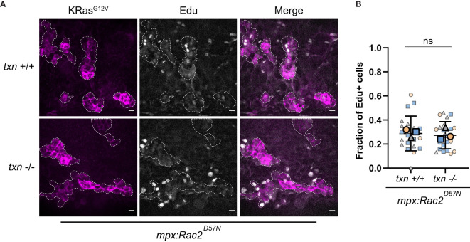 Transformed keratinocyte proliferation is not altered in thioredoxin mutants in the absence of neutrophils. (A) EdU staining (white) of neutrophil-deficient Tg(mpx:Rac2D57N-mcherry) txn+/+ and Tg(mpx:Rac2D57N-mcherry) txn-/- larvae with KRasG12V-expressing basal keratinocytes (magenta) 3dpf. (B) Quantification of frequency of EdU-positive KRasG12V-expressing basal keratinocytes 3dpf in Rac2D57N txn wt (n=21) and Rac2D57N txn mutant (n=22) larvae. Scale bar, 10um. Bolded shapes indicate average value per technical replicate, with shaded values representing data points from independent larvae. Samples were analyzed for statistical significance via t-test ns, not significant.
