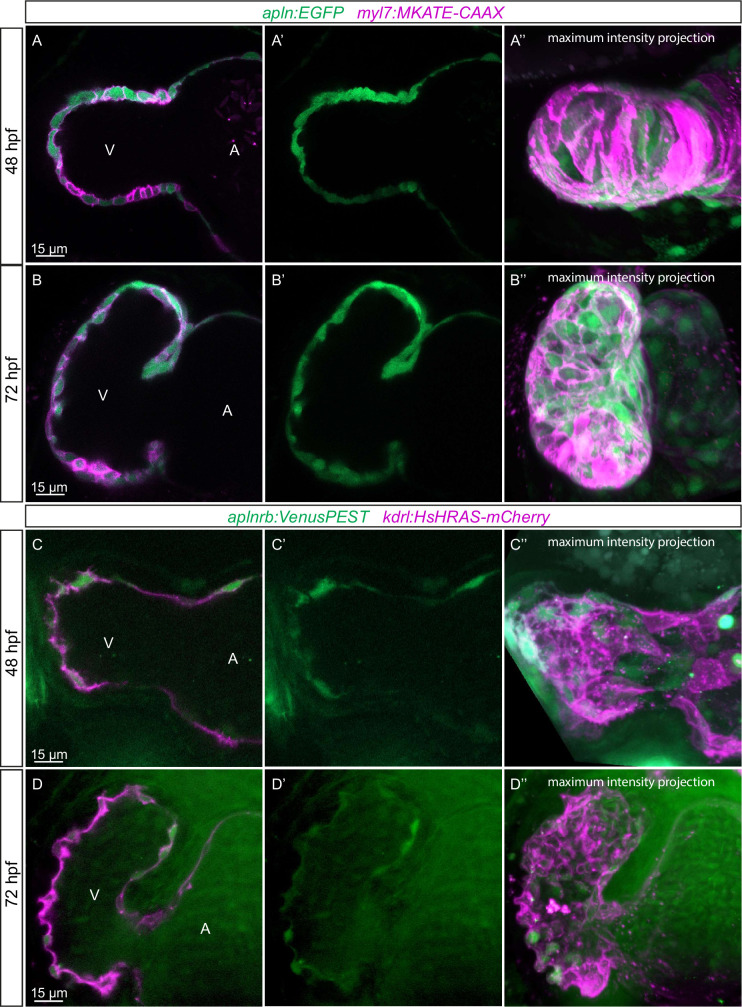 (A–D) Confocal projection images of the heart of TgBAC(apln:EGFP); Tg(myl7:MKATE-CAAX) (A, B) and TgBAC(aplnrb:VenusPEST); Tg(kdrl:HsHRAS-mCherry) (C, D) zebrafish at 48 (A, C) and 72 (B, D) hours post-fertilization (hpf). (A’–’D’) Maximum intensity projections. (A–B) TgBAC(apln:EGFP) expression is detectable in the myocardium at 48 (A) and 72 (B) hpf. (C–D) TgBAC(aplnrb:VenusPEST) expression is detectable in the endocardium with higher expression in the ventricular endocardium at 48 (C) and 72 (D) hpf. All images are ventral views, anterior to the top. V, ventricle; A, atrium.