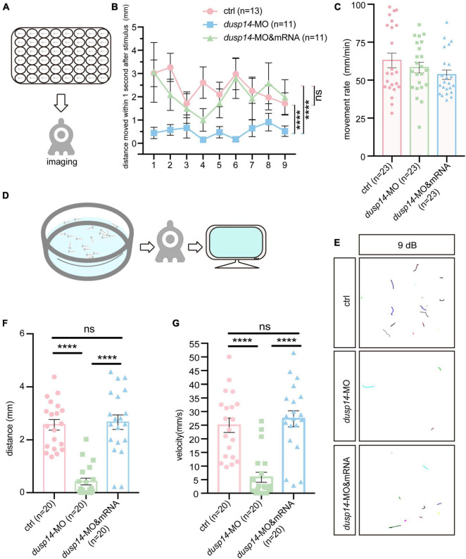 Figure 2. Knockdown of dusp14 gene affects the hearing-related behavioral response in zebrafish. (A) Working diagram of acoustic or vibrational startle test after dusp14-MO injection at 5 dpf. (B) The distance moved of zebrafish within 1 s after the percussion stimulation. (C) Statistics of the moving rate of zebrafish during the total test. (D) The schematic diagram shows the startle response testing equipment. (E) The swimming trajectory of the control, dusp14 morphants and dusp14-mRNA and MO. (F,G) Swimming distance and peak velocity of zebrafish larvae at 5 dpf that reflected the auditory function of zebrafish larvae by examining the startle response. Values with **** above the bars are significantly different (P < 0.0001), ns means no significance.