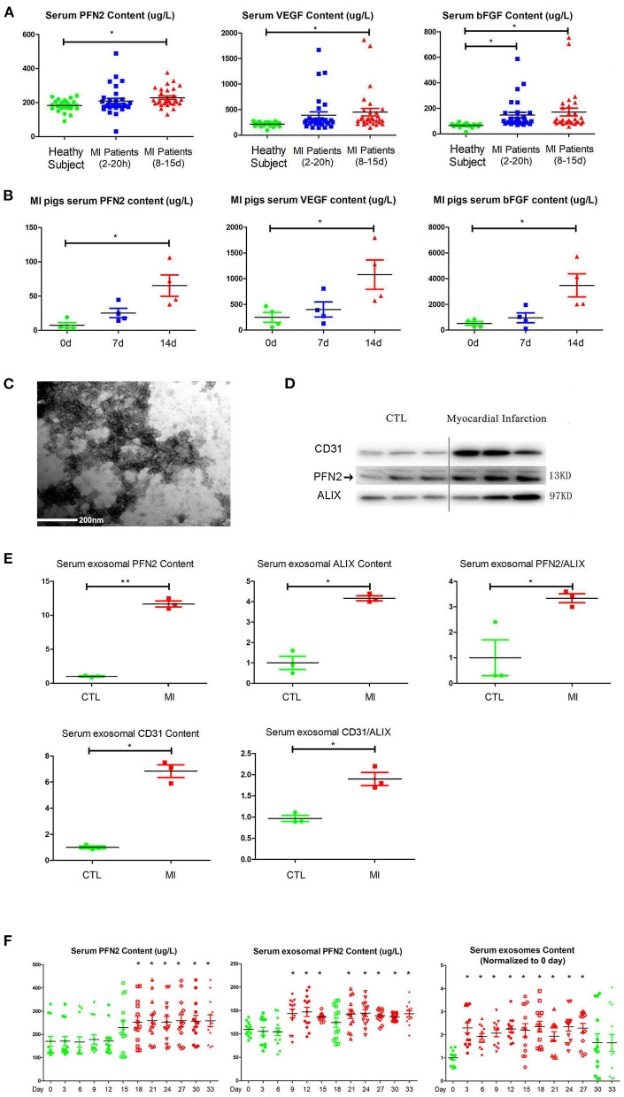 Increased PFN2 and exosomal PFN2 levels in the serum of patients with MI and in animal models. (A) Enhanced PFN2 levels, VEGFA and bFGF levels in patients with MI (patients with MI 2–20 h, n = 30; MI 8–15 d, n = 30; CTL, n = 24). (B) Enhanced PFN2 levels, VEGFA and bFGF levels in pigs with MI (pigs with MI, n = 4; CTL, n = 4). (C) Identification of serum exosomes in patients with MI by electron microscopy. (D) Exosomal PFN2 between CTL (n = 3) and MI groups (n = 3). (E) Exosomal PFN2 levels between CTL (n = 3) and MI groups (n = 3) (The protein level was normalized to control). (F) Serum PFN2 levels, Exosomal PFN2 levels and Exosomes in rats (n = 13) before and after MI. *p < 0.05, one-way ANOVA and repeated-measures ANOVA (Tukey).