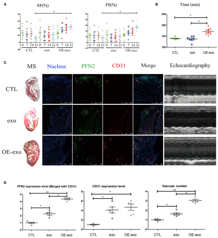 Exosomal PFN2 repairs infarction in mouse with MI and restores cardiac function. (A) The cardiac function of mouse with MI as evaluated by type-B ultrasonic test EF and FS after treatment with exosomes demonstrated the benefit to MI impairment. (B) Physical fitness was evaluated by fatigue test after treatment with exosomes in mouse with MI which displayed significant improvement of heart function, n = 7. (C) Infarction volume (Masson's staining) decreased and PFN2 (green)/CD31 (red) staining increased in heart tissue of mouse with MI after treatment with exosomes. (D) Statistical results of (C). n = 3, normalized to control. *p < 0.05, one-way ANOVA (Tukey).