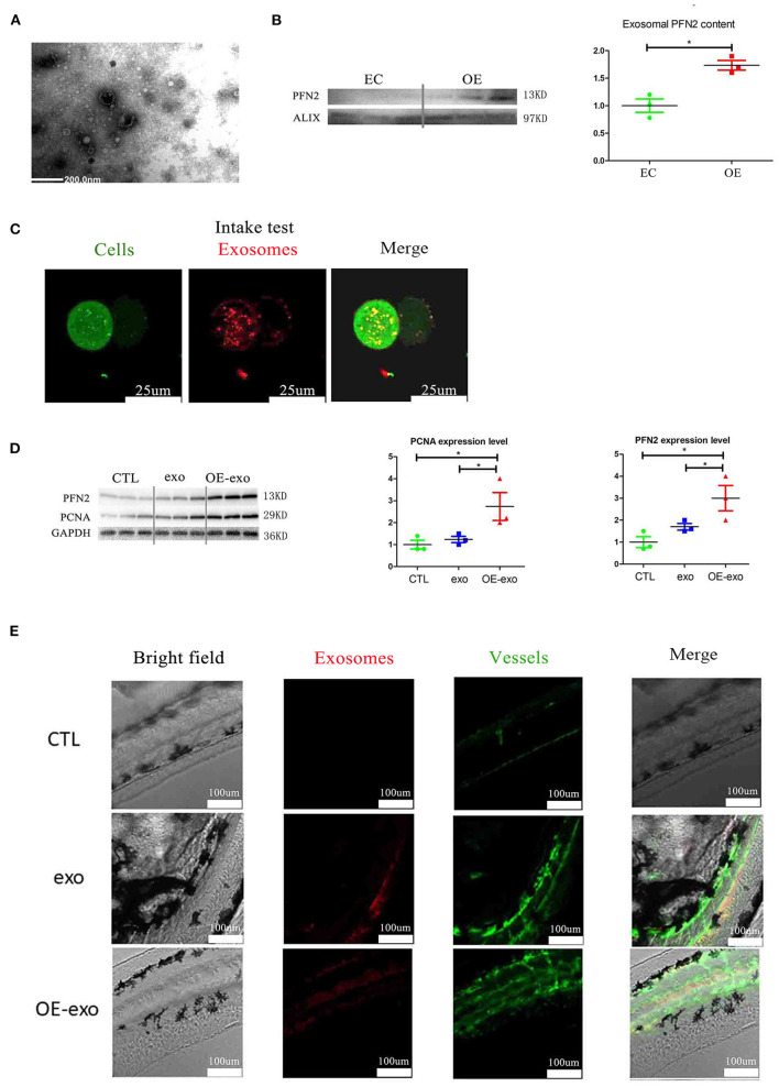 Exosomal PFN2 enhances the proliferation ability of ECs and OE-exo treated zebrafish showed significantly increased vessel number than exo and control.