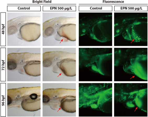 Fig. 6 Blood pooling (red arrow) was observed in the EPN-exposed transgenic zebrafish at 48, 72, and 96 hpf. The control group without exposure to EPN showed normal blood flow circulation, whereas blood flow proceeded irregularly in the EPN-treated groups. The scale bar represents 200 µm. (For interpretation of the references to color in this figure legend, the reader is referred to the web version of this article.)