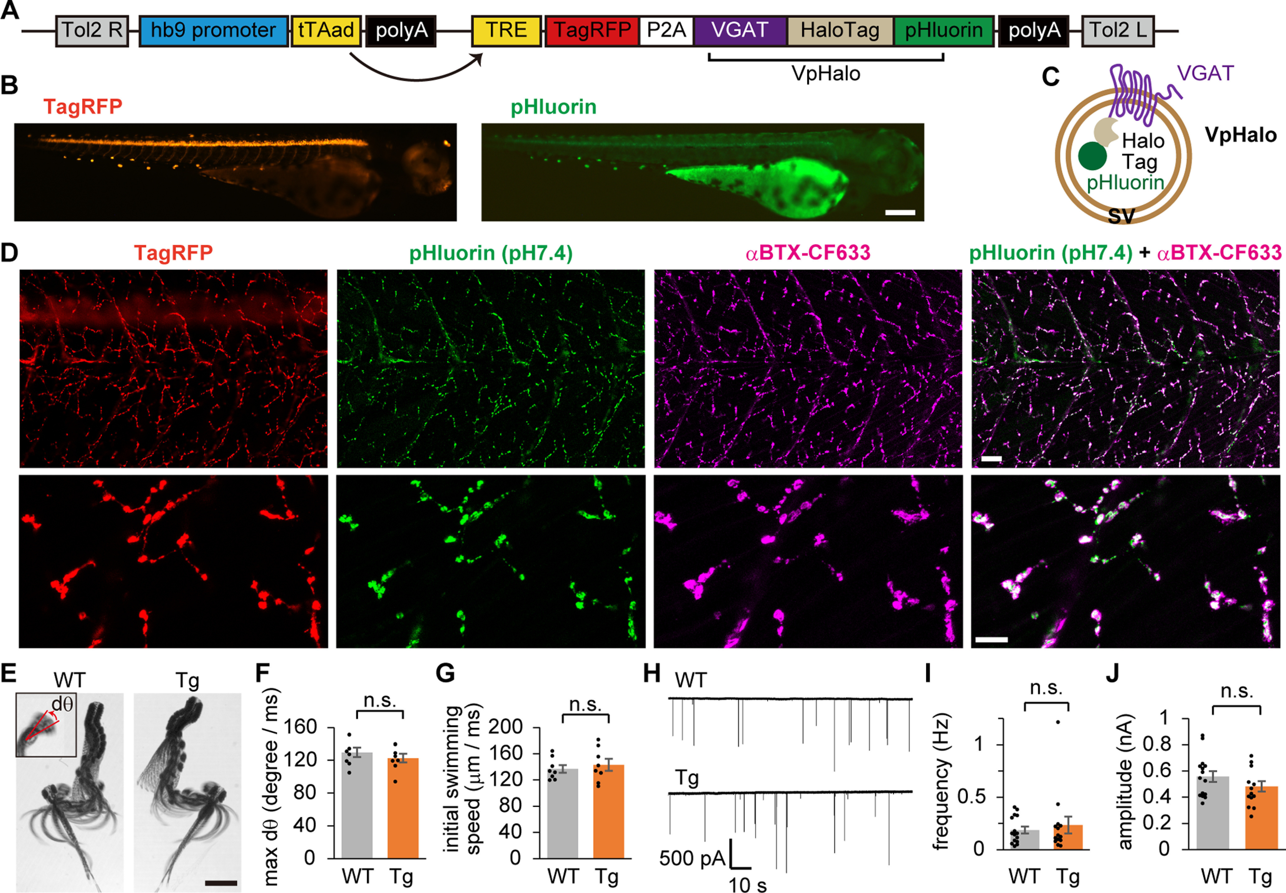 Tg zebrafish expressing two independent indicators of SV recycling in motoneurons. A, Diagram represents the transgene construct introduced in the Tg (hb9:tTAad, TRE:TagRFP-P2A-VpHalo) zebrafish. The hb9 promoter drives the expression of the tTAad, which in turn induces the expression of TagRFP and VpHalo through its interaction with the tetracycline response element (TRE) composite promoter. B, Fluorescent stereoscopic images of TagRFP and pHluorin in an anesthetized Tg zebrafish at 4 dpf. Scale bar, 200 μm. C, Diagram represents VpHalo that resides on the SV membrane. D, Confocal microscopic images of TagRFP, pHluorin (pH 7.4), and postsynaptic AChR clusters visualized by α-BTX-CF633 in PFA-fixed Tg zebrafish. Bottom panels, z-stack images with higher magnification. Scale bars: 20 μm, 10 μm. E, Swimming was elicited by puff stimulus onto the tail of a 4 dpf zebrafish, and the images were captured at 1000 frames/s. Superimposed images at 4 ms intervals are shown for representative larvae from WT or Tg. Inset, An image with two frames superimposed at 1 ms interval, from which dθ corresponding to the head-turn speed (degree/ms) was measured. Scale bar, 1 mm. F, G, Maximum head-turn speed (F) and swimming speed calculated from the distance traveled during initial 30 ms (G) in WT (n = 8 fish) or Tg (n = 8 fish) fish. There was no significant difference between the two groups in head-turn speed (p = 0.39, unpaired t test) or swimming speed (p = 0.58, unpaired t test). H, Representative traces of mEPCs recorded from the fast muscle of WT or Tg zebrafish. I, J, Frequency (I) and amplitude (J) of mEPCs recorded from WT (n = 15 cells from 8 fish) or Tg (n = 14 cells from 6 fish) fish. No significant difference was found between the two groups in terms of frequency (p = 0.60, unpaired t test) or amplitude (p = 0.20, unpaired t test).