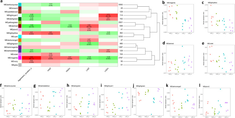 Weighted Gene Coexpression Network Analysis (WGCNA) of the most aggressive high aggression zebrafish (HAZ) compared to the least aggressive low aggression zebrafish (LAZ).