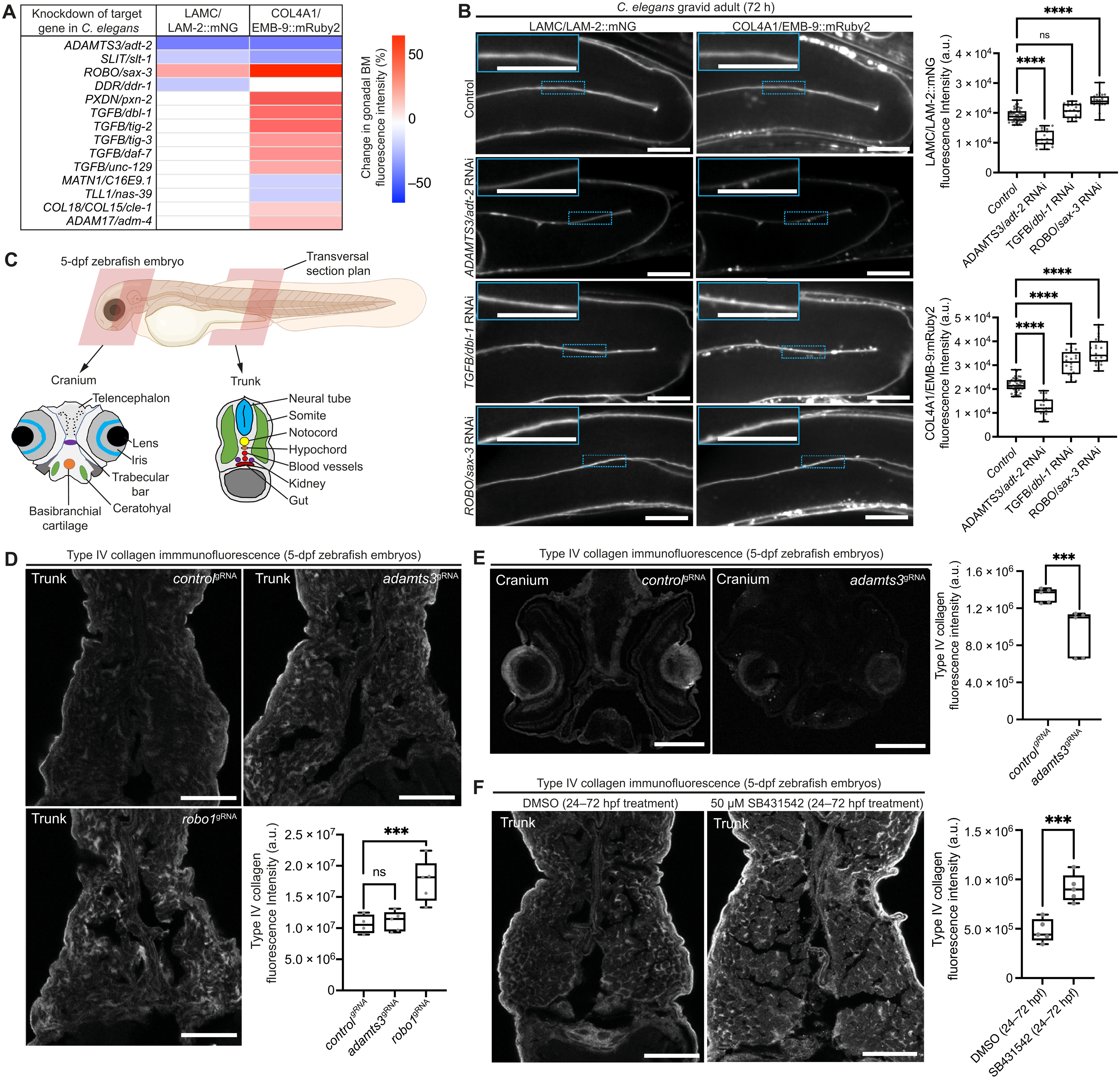 Fig. 4 (A) Heatmap summarizing changes in LAMC/LAM-2::mNG and COL4A1/EMB-9::mRuby2 fluorescence in the gonadal BM upon target gene knockdown in C. elegans. (B) Confocal middle-plane z-slices of gonadal BM LAMC/LAM-2::mNG and COL4A1/EMB-9::mRuby2 in control and RNAi-targeted adt-2, dbl-1, and sax-3 72-hour adult animals (boxed regions are magnified in insets) with quantifications of fluorescence intensity shown on the right (n ≥ 20 each). ****P < 0.0001; ns, not significant; one-way analysis of variance (ANOVA) with post hoc Dunnett’s test. Scale bars, 25 μm. (C) Schematic of a zebrafish embryo [5 days postfertilization (dpf); Biorender] with transversal cross sections depicting tissues in the cranium and the trunk. (D) Confocal images of type IV collagen immunofluorescence in trunk sections of controlgRNA-, adamts3gRNA-, and robo1gRNA-injected 5-dpf embryos. Fluorescence intensity within the entire section is quantified on the bottom right (n = 5 for each treatment). ***P < 0.001, one-way ANOVA with post hoc Dunnett’s test. Scale bars, 30 μm. (E) Collagen IV immunofluorescence in cranial sections of controlgRNA- and adamts3gRNA-injected 5-dpf embryos with quantification of fluorescence intensity on the right (n = 5 for each treatment). ***P < 0.001, unpaired Student’s t test. Scale bars, 30 μm. (F) Collagen IV immunofluorescence in trunk sections of 5-dpf embryos treated with dimethyl sulfoxide (DMSO; control) or SB431542 (TGFBR1 inhibitor) on the left [2-day treatment between 24 and 72 hours postfertilization (hpf)]; quantification of fluorescence intensity on the right (n = 5 each). ***P < 0.001, unpaired Student’s t test. Scale bars, 30 μm. For boxplots, edges indicate the 25th and 75th percentiles, the line in the box represents the median, and whiskers mark the minimum and maximum values.