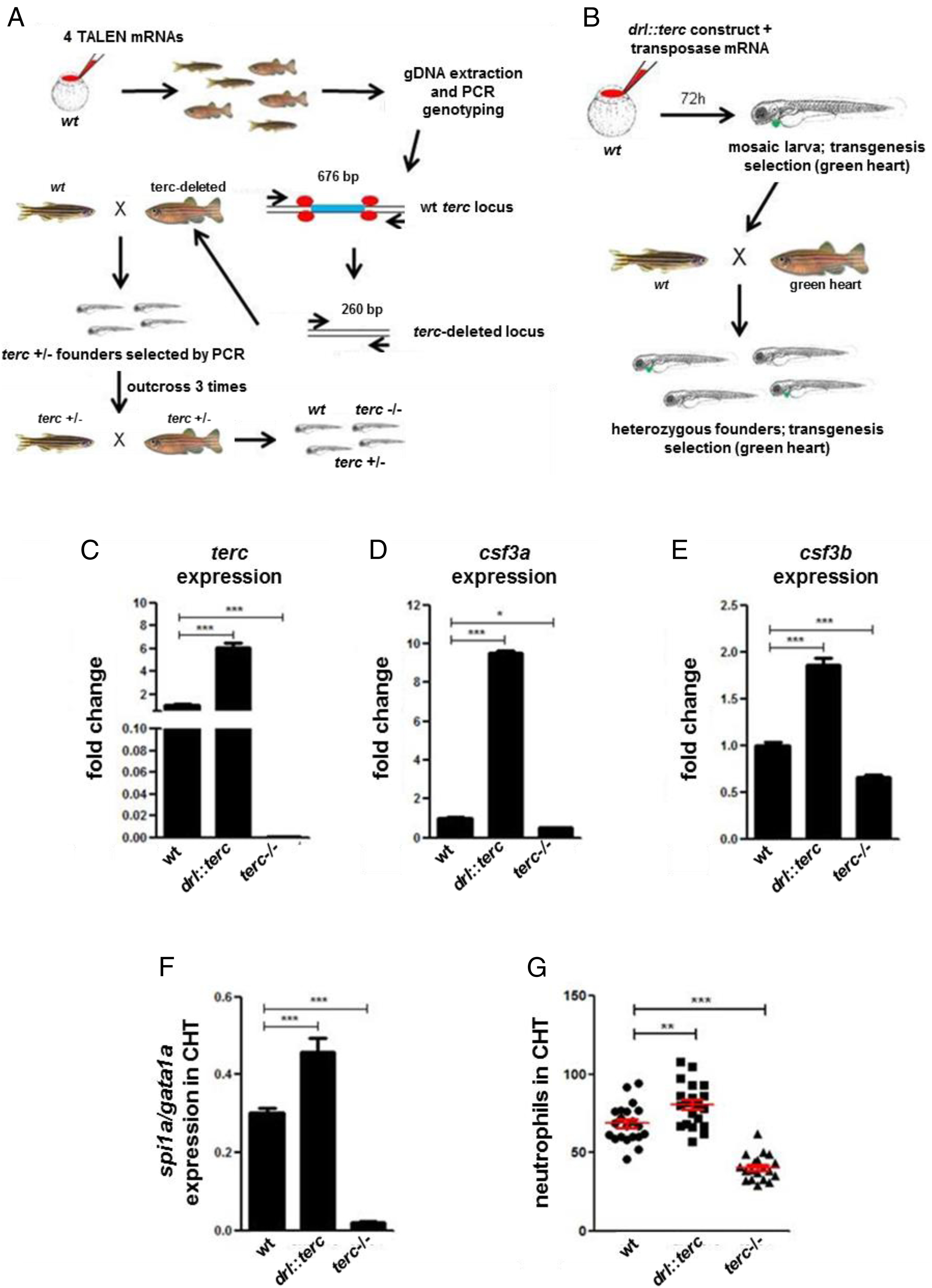 Fig. 1 Zebrafish terc controls the expression of promyelopoietic genes in vivo. (A) Workflow of the generation of the terc−/− (terc KO) zebrafish line. (B) Workflow of the generation of the Tg(drl::terc) zebrafish line. (C–F) Expression of the indicated genes in the CHT of wild-type (wt), Tg(drl::terc), and terc KO fish larvae at 2 dpf. Data are representative results of three independent experiments; n = at least 20 larvae per group. (G) Neutrophil counts in the CHT of mpx::GFP larvae (neutrophils labeled by GFP) at 3 dpf. Data are the average of two independent experiments; n = 21 for wt and Tg(drl::terc), and n = 19 for terc KO. Data values shown are fold change over the value of wt sample in C, D, and E. All data are mean + SEM. *P < 0.05, **P < 0.01, and ***P < 0.001 for one-way ANOVA plus Bonferroni posttest.