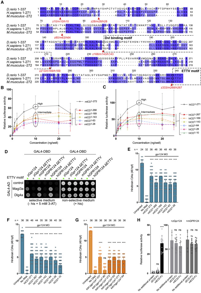 Fig. 5 Figure 5. ICD-deleted mouse and human GPR124 are competent for brain angiogenesis (A) Sequence alignment of zebrafish, mouse, and human Gpr124 intracellular domains. Dvl-binding and ETTV motifs are boxed, and truncations sites are indicated by red arrowheads. (B and C) Luciferase activities of HEK293 STF cells co-transfected with Wnt7a, Fz1, Reck, and increasing amounts of mouse (B) or human (C) GPR124 or their ICD truncation variants. Data are normalized to ELISA data; n = 3. (D) Agar plate growth of spotted yeast cultures co-transformed with different combinations of GAL4-DBD and GAL4-AD fusion constructs onto selective or non-selective conditions. Green and gray dots illustrate, respectively, the presence or absence of the ETTV motif in the GAL4-DBD fusions. (E and F) Quantification of hindbrain CtAs in 48 hpf gpr124 morphant embryos injected at the one-cell stage with 100 pg of the indicated mRNAs of mouse (E) and human (F) Gpr124 and their ICD variants. (G) Quantification of hindbrain CtAs of gpr124 morphant embryos at 48 hpf injected at the one-cell stage with 7 pg of the indicated DNA constructs and 25 pg Tol2 transposase mRNA. Zebrafish data are duplicated from Figure 1H. (H) Luciferase values of HEK293 STF cells co-transfected with Wnt7a, Fz1, and Reck, with or without zebrafish Gpr124 or mouse Gpr124, and supplemented or not with 10 mM of the indicated recombinant protein, n = 3. Related to Figures S3 and S4.