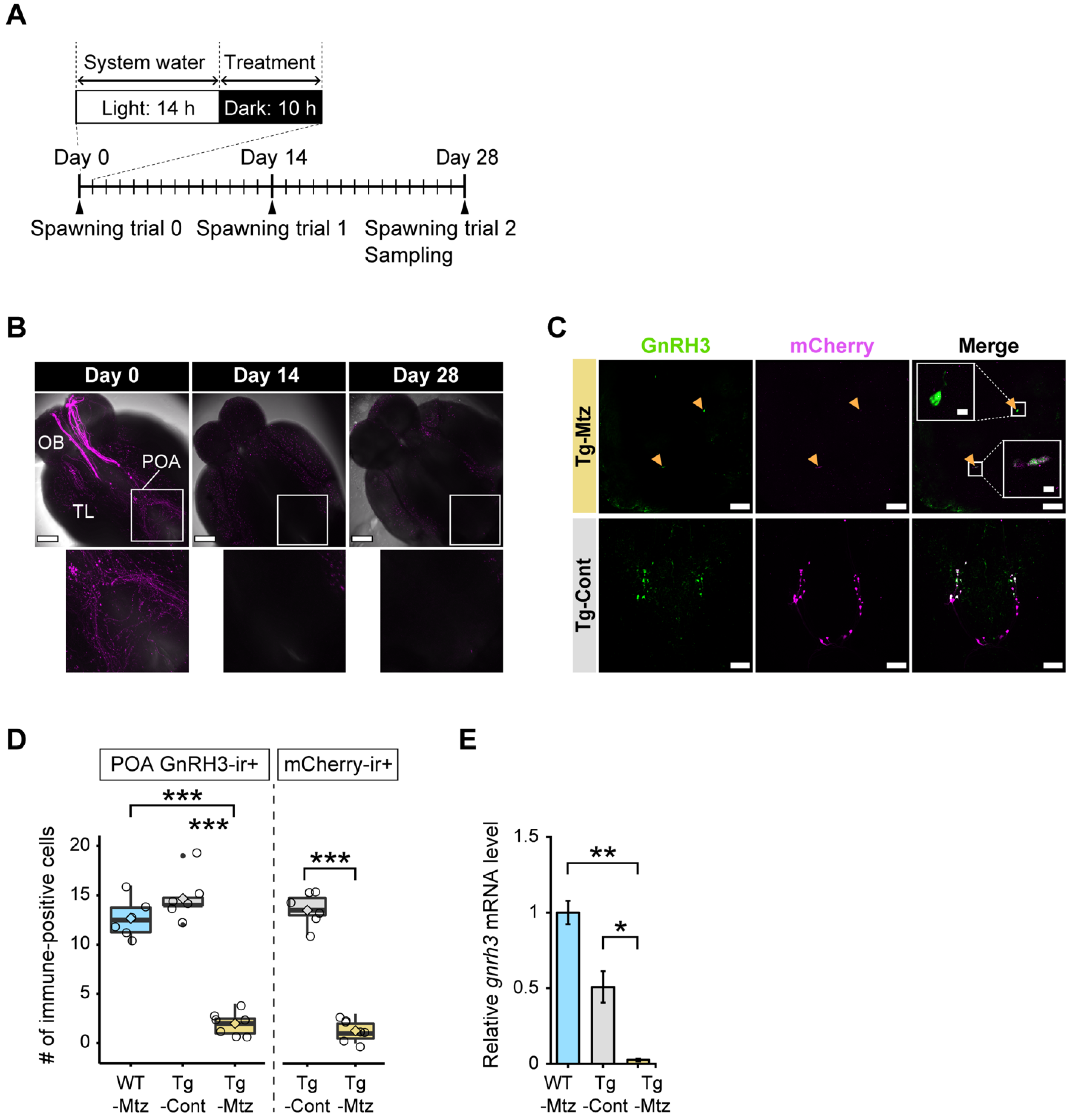 GnRH3 neuronal ablation is validated in the brain at 28 days of treatment. (A) Treatment and analysis schedule. Fish were exposed to 2 mM Mtz daily during the dark phase for 28 days, and were sampled at 14 and 28 days into the treatment. (B) Top panel: confocal images of GnRH3 neurons expressing NTR-mCherry fusion protein (magenta) in whole brains from the Tg(gnrh3:Gal4ff; UAS:nfsb-mCherry) fish before the treatment, and at 14 and 28 days of treatment. Bottom panel: POA-zoomed images showing the boxed area from the top images. Scale bars, 200 µm. (C) Confocal images of co-immunostaining of GnRH3-associated peptide (green) and mCherry (magenta) in the whole brain of Tg-Mtz (top panels) and Tg-Cont (bottom panels) at 28 days of treatment. GnRH3 neuron cell bodies co-localized with mCherry in Tg-Mtz are labeled by arrowheads. Scale bars, 100 µm. Insets, zoomed images of GnRH3-ir and mCherry-ir neuron cell bodies co-localization showing the boxed areas of the merged image in Tg-Mtz. Scale bars, 10 µm. (D) Numbers of GnRH3-positive cells (left) and mCherry-positive cells (right) in the POA (n = 6–7). (E) Relative gnrh3 mRNA levels in the whole brain (n = 4 each). OB, olfactory bulb; TL, telencephalon; POA, preoptic area; ir, immunoreactive; WT-Mtz, WT siblings treated with 2 mM metronidazole (Mtz); Tg-Cont, Tg(gnrh3:Gal4ff; UAS:nfsb-mCherry) treated with vehicle; Tg-Mtz, Tg(gnrh3:Gal4ff; UAS:nfsb-mCherry) treated with 2 mM Mtz. *, p < 0.05; **, p < 0.01; ***, p < 0.001.