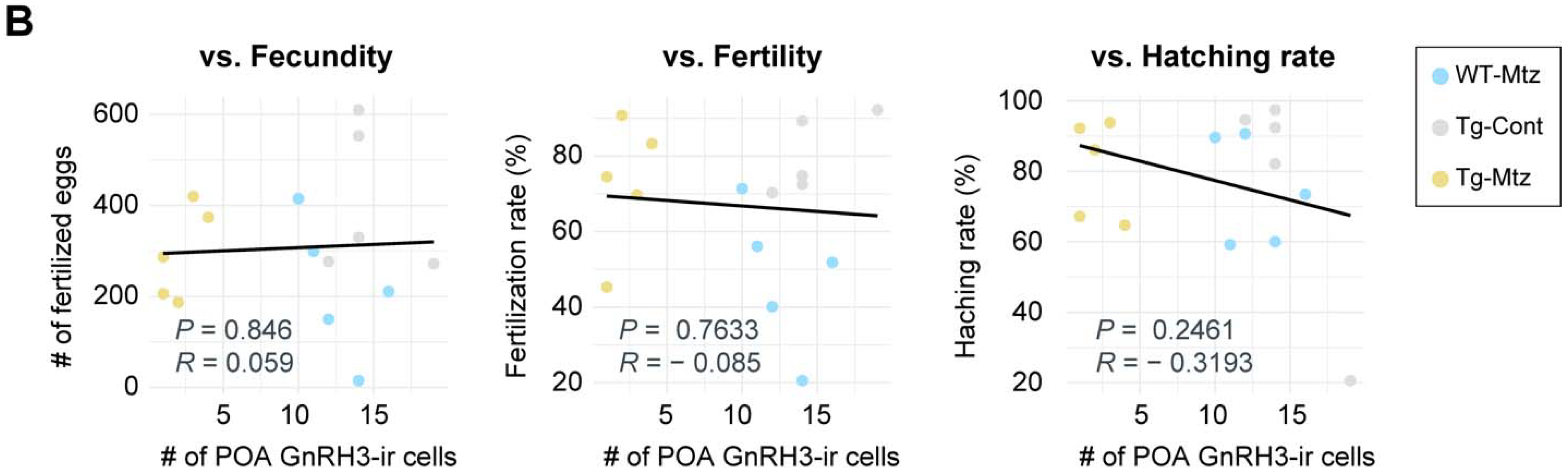No correlation is observed between the number of detectable POA GnRH3 neurons and each reproductive parameter at 28 days of treatment. (