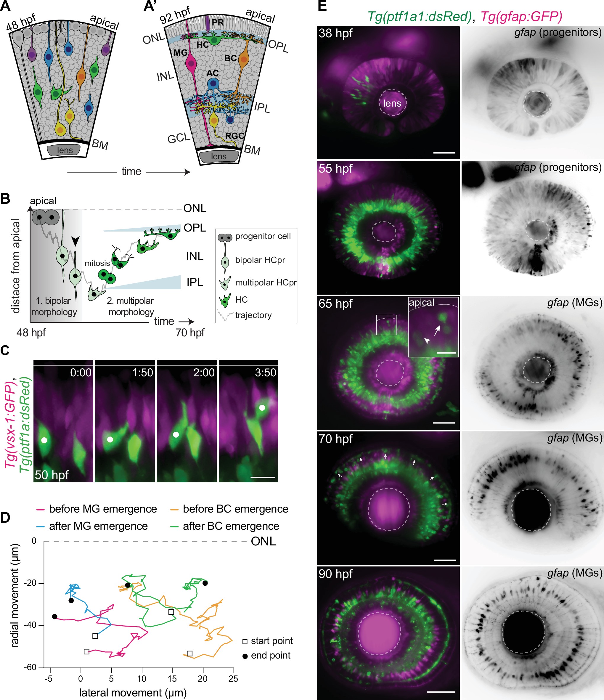 (A–A’) Schematic representation of zebrafish retinal development: (A) Neuronal birth and migration (48 hours post fertilization [hpf]). Neuroepithelial progenitors (gray) divide at the apical side and give birth to five major neuron types:photoreceptor (PR), HC, bipolar cell (BC), amacrine cell (AC), retinal ganglion cell (RGC). (A’) The layered organization of the mature zebrafish retina (92 hpf). Retinal neurons and a single type of retina glial cell, MGs, are arranged in three nuclear layers from apical to basal: outer nuclear layer (ONL), inner nuclear layer (INL), ganglion cell layer (GCL). These layers are separated by two plexiform layers: outer plexiform layer (OPL) and inner plexiform layer (IPL). The basement membrane (BM) separates the GCL from the vitreous body. (B) Scheme of bidirectional and bimodal migration of an HC progenitor and its committed precursors. Division of neuroepithelial progenitor (gray) generates HC progenitors (HCprs) (light green). HCprs display a bipolar morphology and are attached to the apical surface during the first phase of migration. Upon apical detachment, HCprs show multipolar morphology. En route to their destination, multipolar HCprs undergo a terminal mitosis to generate two HCs (green), which migrate toward the HC layer. Arrowhead: detachment of HCpr from the apical surface and onset of multipolar migration. Gray line: a representative HC migration trajectory (see also stills and trajectory in Figure 1—figure supplement 1A-B). (C) Time-lapse of HC tangential migration before BC lamination (50 hpf). Tg(vsx-1:GFP) labels BCs (magenta) and Tg(ptf1a:DsRed) marks HCs (green). White dot: tracked HC. Time in h:min. Scale bar: 10 μm. (D) Basal-to-apical migration trajectories of HCs before and after emergence of mature radially oriented BCs and MGs. HCs use both radial (apical-basal) and tangential (lateral) routes to move within the INL. See Figure 1—source data 1. (E) Maximum projections of retinae at different developmental stages: 38, 55, 65, 70, and 90 hpf. Tg(ptf1a:dsRed) labels HCs and ACs (green) and Tg(gfap:GFP) labels MGs (magenta). 38 hpf: birth and initiation of HC basal migration. GFAP+ cells are progenitors. 55 hpf: initiation of HC apical migration. 65 hpf: peak of HC apical migration. Higher magnification inset of the outlined region shows an HC at its final destination (arrow), and a migrating HC en route to the apical side (arrowhead). 70 hpf: emergence of the HC layer and MG maturation. arrows: show HCs within the HC layer. 90 hpf: mature and fully laminated retina. Scale bars: 50 μm, inset 65 hpf: 10 μm. See also Figure 1—figure supplement 1.