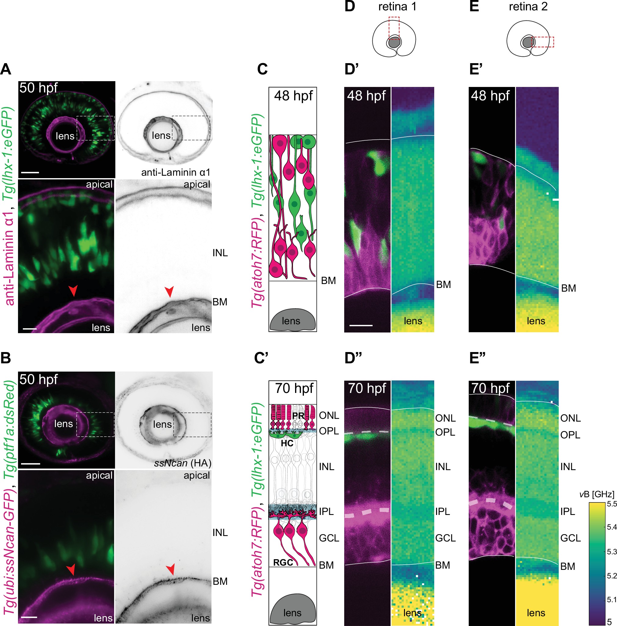 (A–B) The INL is not dominated by ECM: (A) Tg(lhx-1:eGFP) labels horizontal cells (HCs) (green). Laminin α1 antibody marks laminin (magenta). (B) Tg(ptf1a:dsRed) marks HCs and amacrine cells (ACs) (green). Tg(HA:GFP) labels hyaluronic acid (HA) (magenta). Higher magnification insets show enrichment of anti-Laminin α1 and HA in the basement membrane (BM) (red arrowheads). Scale bars: 50 μm; insets 10 μm. (C–C’) Scheme of structural organization of the retina during development: (C) During HC migration at 48 hours post fertilization (hpf); (C’) after HC layer formation at 70 hpf. HCs (green); photoreceptors (PRs) and retinal ganglion cells (RGCs) (magenta). (D–E”) Brillouin shift maps (right) and their corresponding confocal images (left) of double-transgenic zebrafish of (D–D’’) retina 1 and (E-E’’) retina 2. Top: 48 hpf, and bottom: 70 hpf. Tg(lhx-1:eGFP) labels HCs and ACs (green), Tg(atoh7:RFP) is expressed in RGCs and PRs (magenta). Confocal images were obtained directly after the Brillouin shift measurements. The corresponding Brillouin shift maps of the nuclear layers (outer nuclear layer [ONL], inner nuclear layer [INL], ganglion cell layer [GCL]) show a higher Brillouin shift than the plexiform layers (outer plexiform layer [OPL], inner plexiform layer [IPL]) at 70 hpf. Red dashed boxes in D–E: imaged regions. Scale bar: 10 µm. See also Figure 2—figure supplement 1.