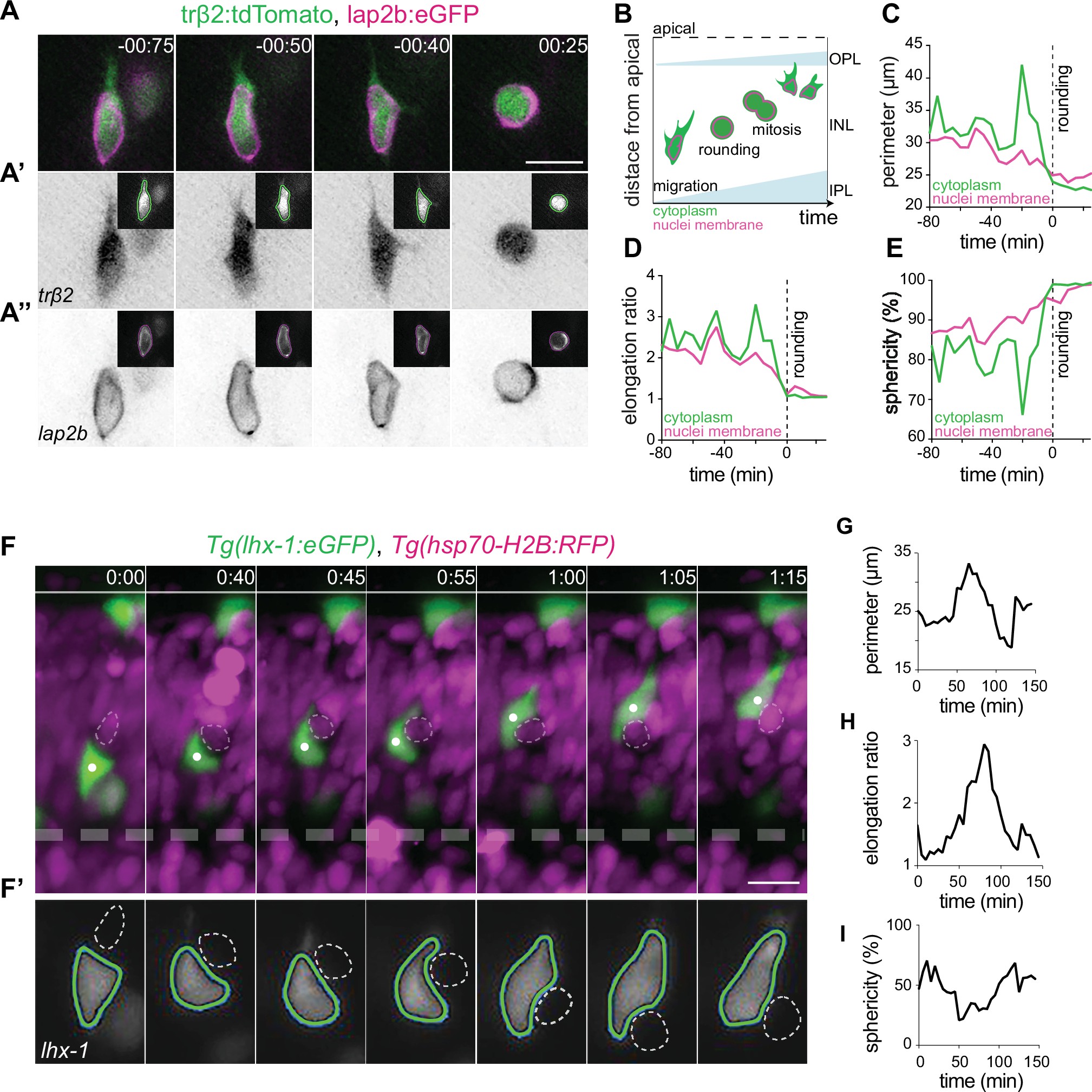 (A–E) The cell bodies and nuclei of migrating horizontal cells (HCs) are deformable. (A) Time-lapse of an HC during migration and at entry into mitosis. The HC cell body is visualized by trβ2:tdTomato (green), and its nuclear envelope by lap2b:eGFP (magenta) DNA constructs. Insets show the corresponding segmented contours of the tracked HC’s generated by Icy: (A’) cell body (green lines) and (A’’) nucleus (magenta lines) which were used to extract cellular and nuclear morphodynamic features in (C–E). Scale bar: 10 µm. (B) Schematic representation of a typical basal-to-apical migration trajectory of an HC progenitor which undergoes mitosis en route. During mitosis, HCs switch from an elongated shape into a spherical morphology. (C–E) Graphs show quantification of the dynamics of the cell and nucleus shape changes of the migrating HC depicted in (A): (C) perimeter (μm), (D) elongation ratio, and (E) sphericity (%). Note that the minimal perimeter (μm), minimal elongation ratio, and maximal sphericity (%) are reached upon cell rounding during mitosis. Dashed lines: onset of HC rounding. See Figure 3—source data 1. (F–I) Migrating HCs squeeze in the crowded retina to overcome local physical obstacles. (F) Stills from light-sheet time-lapse imaging show that the migrating HC (green) undergoes cell-shape deformations to circumvent a mitotic neighboring cell (dashed circle). Tg(lhx-1:eGFP) labels HCs (green), Tg(hsp70-H2B:RFP) marks nuclei of all retinal cells (magenta). White dot: tracked HC; line: apical surface; dashed line: inner plexiform layer (IPL). Scale bar: 20 µm. (F’) The automated segmented contours of the cell body of the migrating HC (green line) generated by Icy. Dashed circle: the nucleus of the neighboring cell from (F). (G–I) Graphs represent quantifications of cell morphodynamic changes in HC from (F–F’): (G) perimeter (μm), (H) elongation ratio, and (I) sphericity (%). Time in h:min (A, F). See Figure 3—source data 1. See also Figure 3—figure supplements 1 and 2.