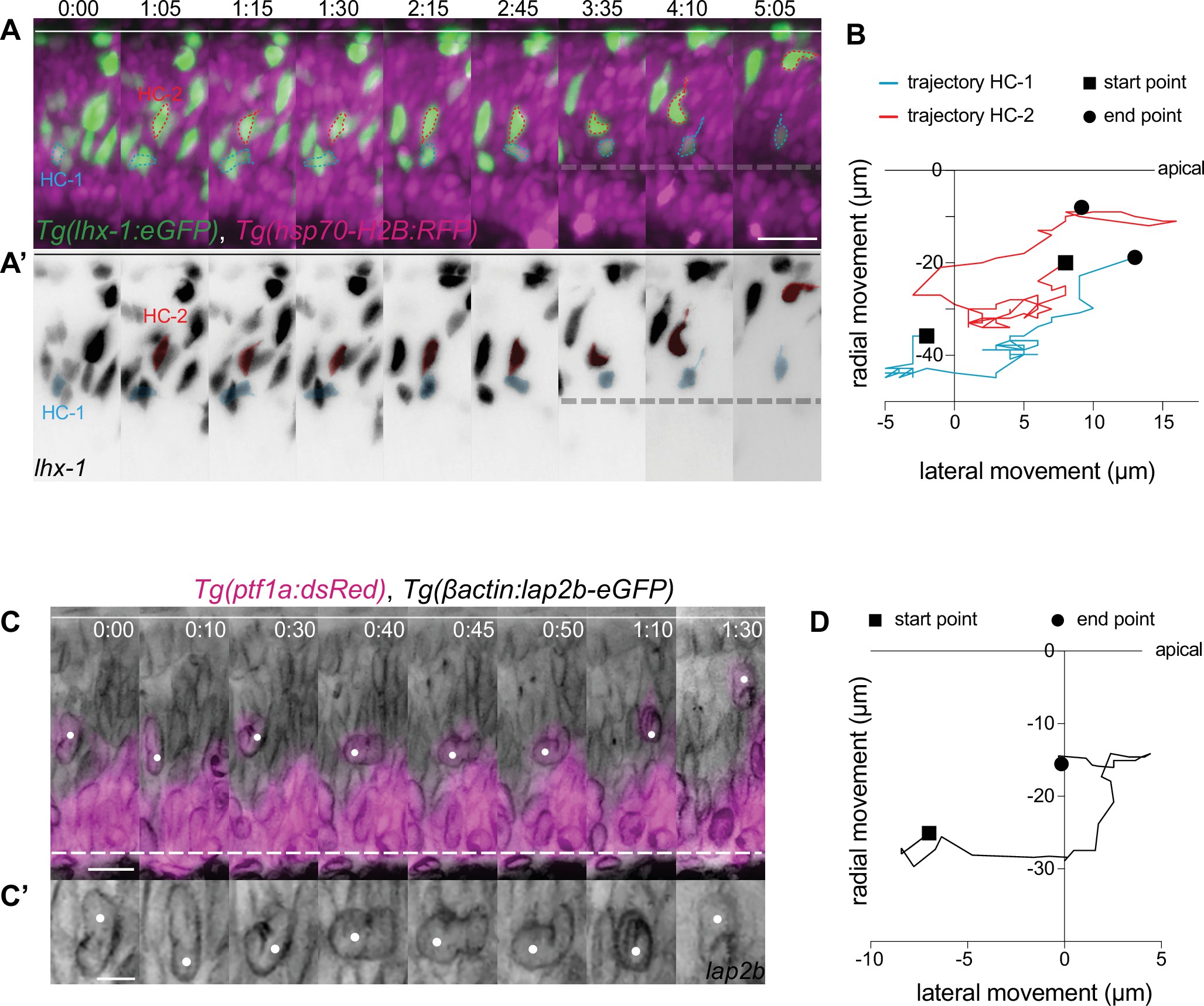 (A) Stills from time-lapse images of basal-to-apical migration trajectories of two horizontal cells (HCs): blue dashed line: HC-1; red dashed line: HC-2 in the crowded retina. Time series show that both HCs change direction and cell shape while moving toward their final position. Tg(lhx-1:eGFP) labels HC cytoplasm (green) and Tg(hsp70:H2B-RFP) is expressed in all retinal nuclei (magenta). Line: apical surface, dashed line: forming inner plexiform layer (IPL); scale bar: 20 μm. (A’) Insets of HC cytoplasm (gray) from (A). HC-1; blue contour: HC-1; red contour: HC-2. (B) Radial-tangential migration trajectories of HCs from (A-A’). Tracked HCs change direction in both radial (apical-basal) and tangential (lateral) axis while moving to their final laminar site. See Figure 3—source data 3. (C) Direction change and nuclear deformations of a tracked HC as it moves through the crowded retina. lap2b:eGFP DNA labels nuclear envelopes (gray). HCs and amacrine cells (ACs) are labeled in Tg(Ptf1a:dsRed) (magenta). Line: apical surface; white dot: tracked HC; dashed line: IPL; scale bar: 10 μm. (C’) Higher magnification insets of HC nuclei envelope from (C). Scale bar: 5 μm. (D) Radial-tangential migration trajectory of HC from (C). See Figure 3—source data 3. Time in h:min (A, C).