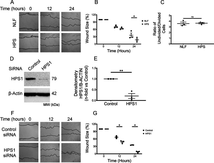 Enhanced HPSLF migration in vitro is HPS1-dependent. A, F Representative microscopy images of scratch assays at 0, 12, and 24 h after gaps were generated. Scratch assays were performed with A NLF (n = 3 technical replicates) and HPSLF (n = 3 technical replicates); F NLF transfected with control or HPS1 siRNA; B, G Quantitative analysis of the migration potential of B NLF and HPSLF; G NLF transfected with control or HPS1 siRNA. The rate of fibroblast migration was determined by calculating the percentage of open wound area at the indicated time points to that of the corresponding initial scratch. C Ratio of CFSE MFI from proliferating cells over undivided cells D Western blot analysis of HPS1 protein expression in NLF transfected with either control or HPS1 siRNA. β-Actin was used as a loading control. E Ratio of HPS1 to β-Actin density expressed as fold change relative to NLF transfected with control siRNA. Data are expressed as mean ± SEM of three independent experiments. B, G Data analyzed using two-way mixed ANOVA *P < 0.05. C, E Data was analyzed using Student’s t-test *P < 0.05, **P < 0.01